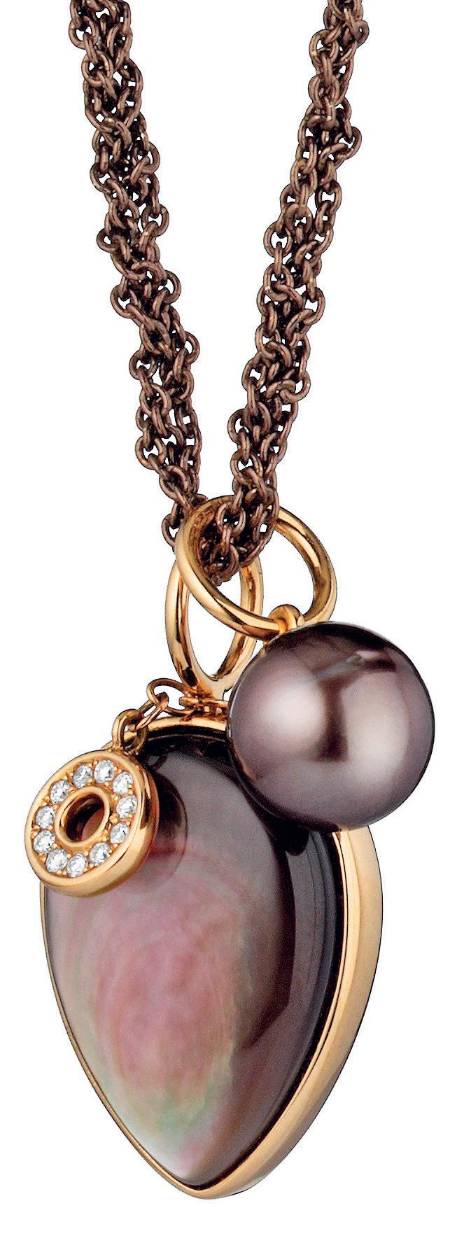 Das feine, braun rhodinierte Silbercollier «Melange» der Schmuckmanufaktur «Gellner» vereint einen mit Roségold umrahmten Perlmutt-Anhänger, einen Einhänger aus elf Brillanten und eine handverlesene Tahiti-Zuchtperle. Zigerli+Iff, Spitalgasse 14, Bern. zigerli+iff.ch