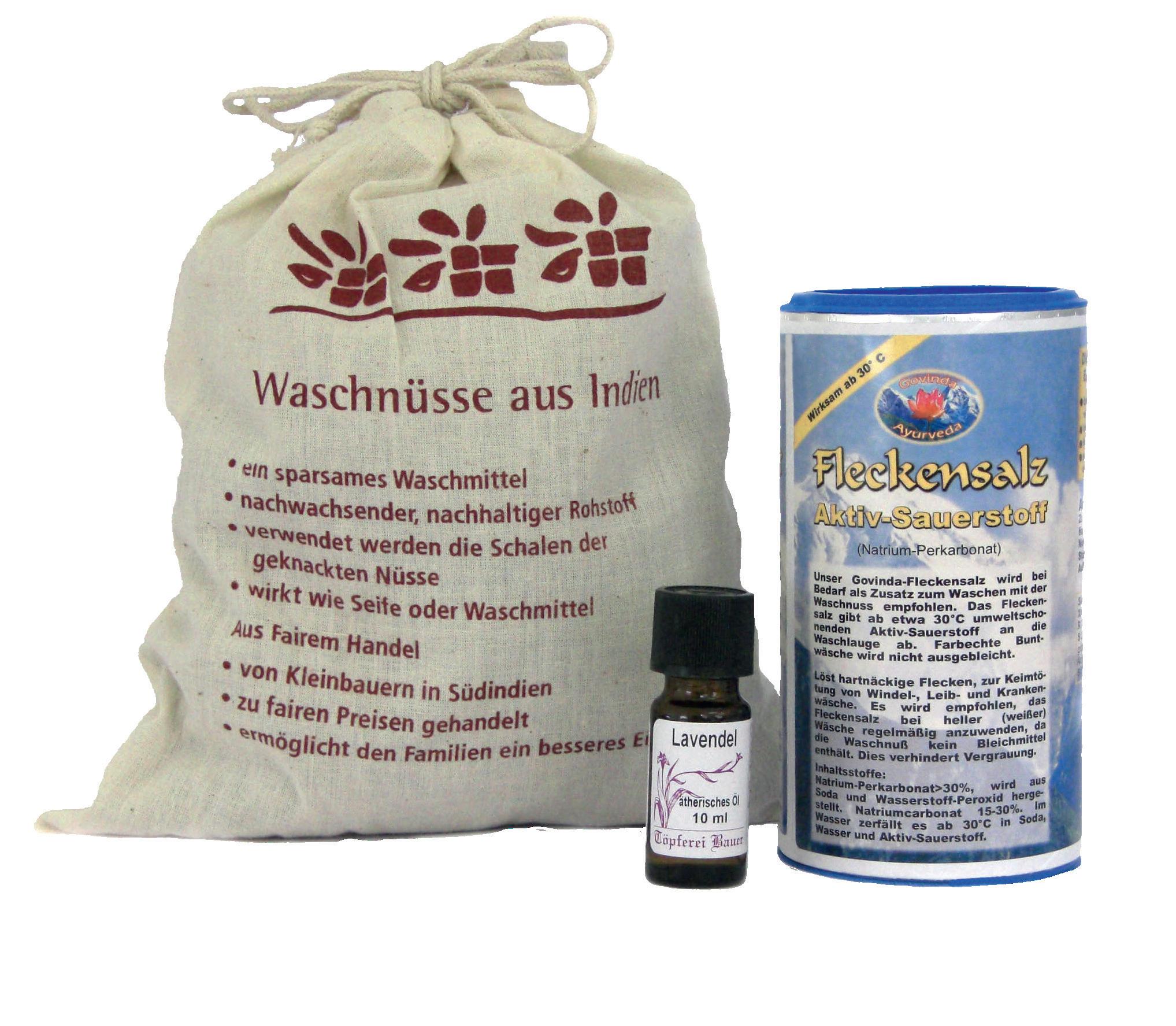 Waschnüsse sind ein nachwachsendes, rein pflanzliches Naturprodukt und eine ökologische und preiswerte Alternative zu herkömmlichen Waschmitteln. Sie werden in einem Baumwollbeutel direkt zur Wäsche gegeben und geben bei Wasserkontakt eine seifige Lauge ab. Auch für Allergiker geeignet. Set: 500 g Waschnüsse, 500 g Fleckensalz, 10 ml Lavendelöl.