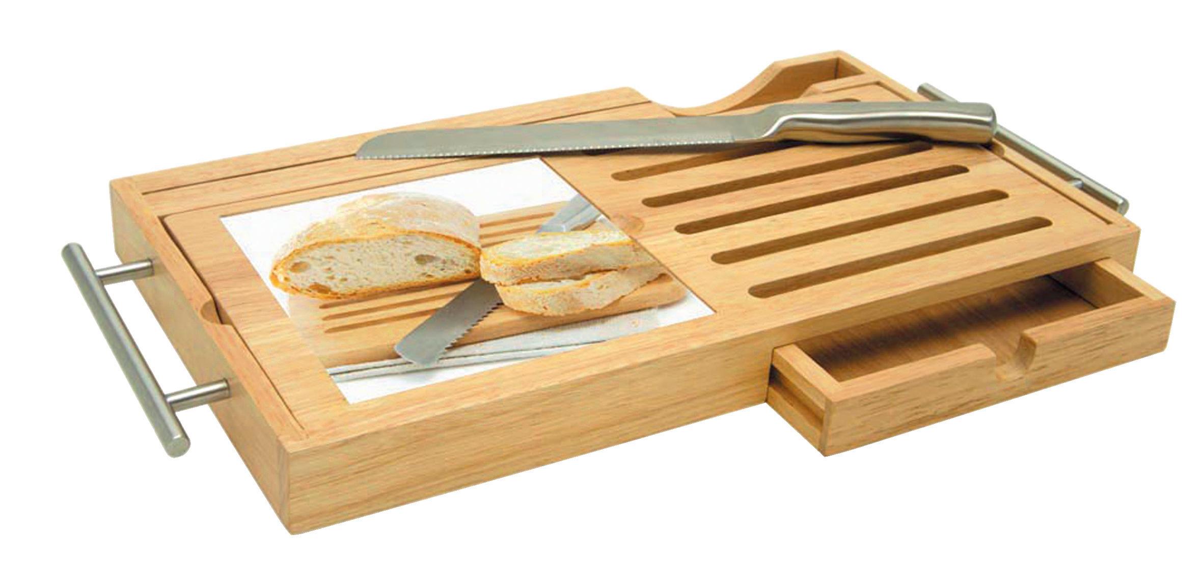 Brotschneidebrett mit Messer Das Brotschneidebrett aus Holz fängt dank Rost und die Schublade Brotkrümel beim Schneiden sauber auf. Eine Glasplatte mit Dekor lässt das Brett auch unbenutzt gut aussehen. Dazu gehört ein Brotmesser von EasyLife. Masse: 46 × 23 cm.