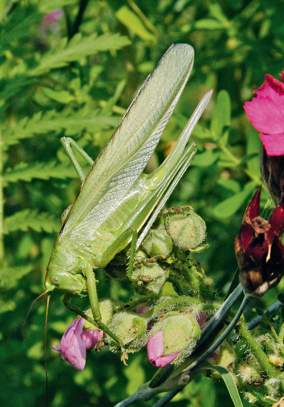 Nicht vom Nektar selbst angelockt, sondern auf der Jagd nach den Nektarsuchenden treiben sich allerlei weitere Gesellen im Blütenmeer herum. Da lauert beispielsweise das Grosse Heupferd im Staudengewirr. Unerwartet landet eine Kleinlibelle auf seinem Rücken, bemerkt den Irrtum, hebt blitzartig wieder ab und landet in den Nachbarstauden.