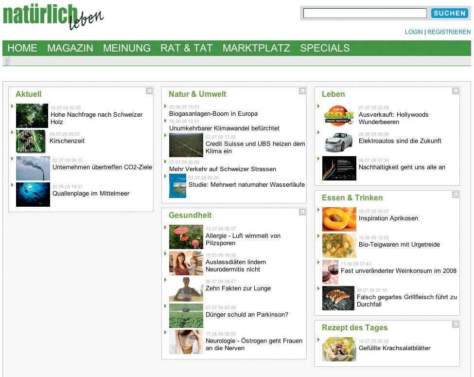 Leserinnen und Lesern im Internet noch mehr Service. Auf unserer Homepage erhalten Sie im frisch aufgeschalteten Newsportal täglich die neusten und wichtigsten Informationen zu Gesundheit, Natur und Umwelt, Essen und Trinken oder aktuellen Terminen. Damit sind Sie im Bereich «Natürlich leben» zukünftig immer auf dem aktuellen Stand und wissen, was läuft.