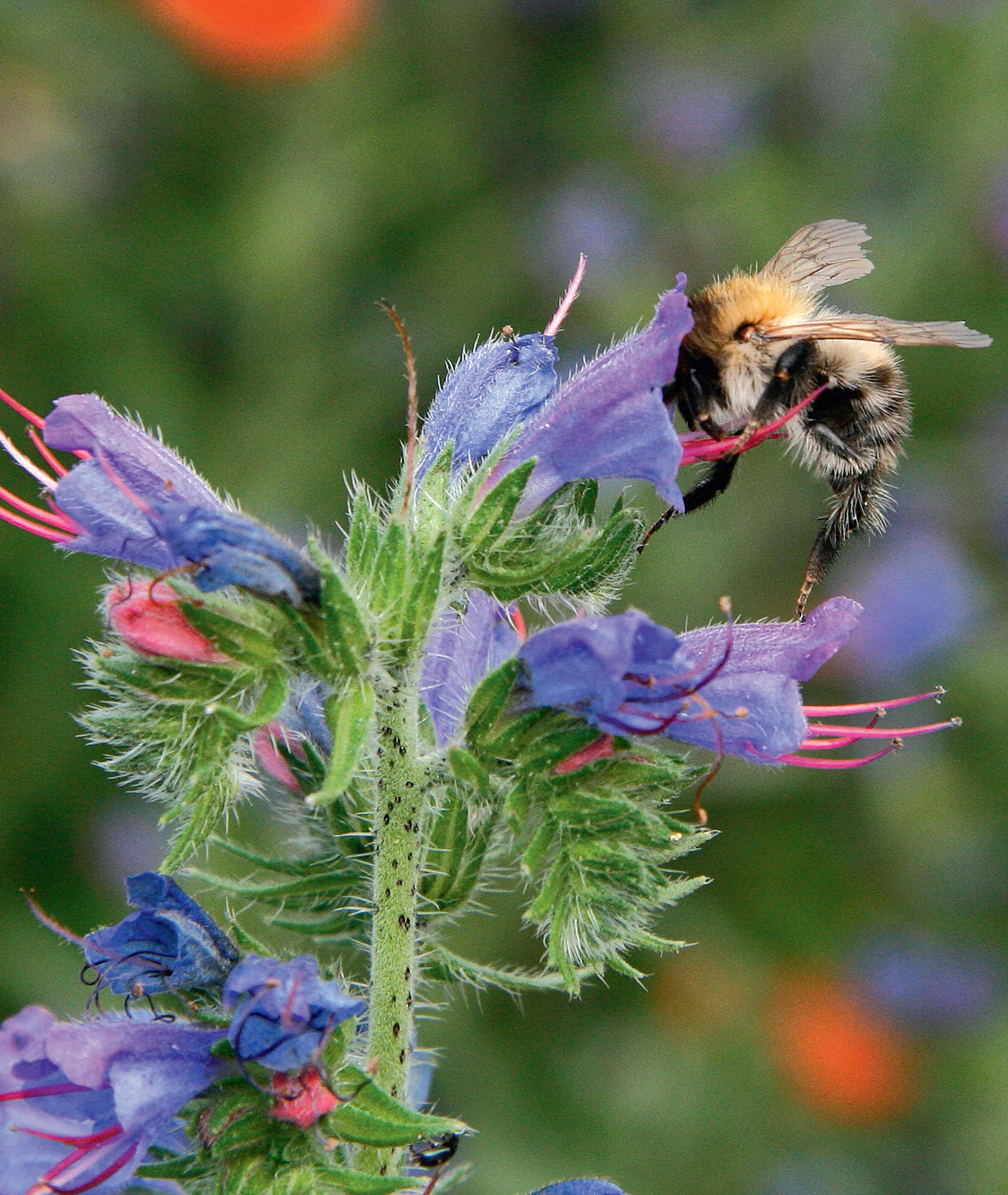 Die Blumen blühen zu dieser Jahreszeit um die Wette und buhlen mit Blütenstaub und Nektar um Bestäuber. Wer sich an diesem Treiben nicht sattsehen und -hören kann, lenkt den Schritt in jene Gartenpartien, wo die besten Nektarlieferanten mit Farbfanfaren locken: feuerrot der Klatschmohn, strahlend gelb das Johanniskraut, pink die Karthäusernelke, himmelblau die Wegwarte, blau-lila der Natternkopf und zart rosa der Wilde Majoran. Mit Sicherheit ist hier bei schönem Wetter das Fest in vollem Gang.