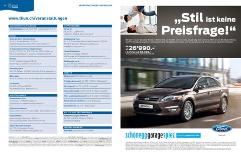 ford.ch IMPRESSUM ISSN 1662-0992 HERAUSGEBER: Stadt Thun, in Partnerschaft mit der Innenstadt-Genossenschaft Thun IGT und Thun Tourismus. VERLAG, KONZEPT, REALISATION: Weber AG, Werbeagentur und Verlag, Gwattstrasse 125, 3645 Gwatt, Tel. 033 336 55 55, Fax 033 336 55 56, E-Mail thun@weberag.ch. LEITUNG: Philippe Haeberli, Tanja Look und Jürg Alder, Stadt Thun; Ursula Thöni, IGT; Annette Weber, Weber AG Verlag. INSERATE: Christine Hunkeler, Weber AG. STADTREDAKTION: Jürg Alder (Leitung), Stephan Schneider, Thomas Judt, Hans Mischler, Elisabeth Gehrig, Caroline Dettwiler, Rachel Neuenschwander. Beiträge, die mit diesem Logo gekennzeichnet werden, sind offizielle Inhalte der Stadtverwaltung Thun. REDAKTION IGT/MENSCHEN/ WEITERE BEITRÄGE: Weber AG Verlag. TITELBILD: Beat Straubhaar, Weber AG. CARTOON: Michael Streun, Thun. AUFLAGE: 60 000 Exemplare. ERSCHEINUNGSWEISE: 7× jährlich. DRUCK: Swiss Printers AG, Zofingen. PAPIER: 80gm2, weiss, matt gestrichen. VERTEILUNG: Stadt Thun, Aeschlen, Allmendingen, Amsoldingen, Bleiken, Blumenstein, Brenzikofen, Buchen, Burgistein, Eriz, Fahrni, Forst, Gunten, Gurzelen, Gwatt, Heiligenschwendi, Heimberg, Heimenschwand, Hilterfingen, Höfen, Homberg, HorrenbachBuchen, Hünibach, Innereriz, Jaberg, Kienersrüti, Kiesen, Längenbühl, Merligen, Niederstocken, Oberhofen, Oberstocken, Pohlern, Reutigen, Ringoldswil, Schwanden, Schwarzenegg, Schwendibach, Seftigen, Sigriswil, Steffisburg, Süderen, Teuffenthal, Thierachern, Tschingel, Uebeschi, Uetendorf, Unterlangenegg, Uttigen, Wattenwil, Wimmis und Zwieselberg. Zusätzlich in Geschäften und Hotels in der Thuner Innenstadt, Kaserne Thun. LESE-APP: Gratis-Download im App Store. NÄCHSTE AUSGABE: 22. Oktober 2013.
