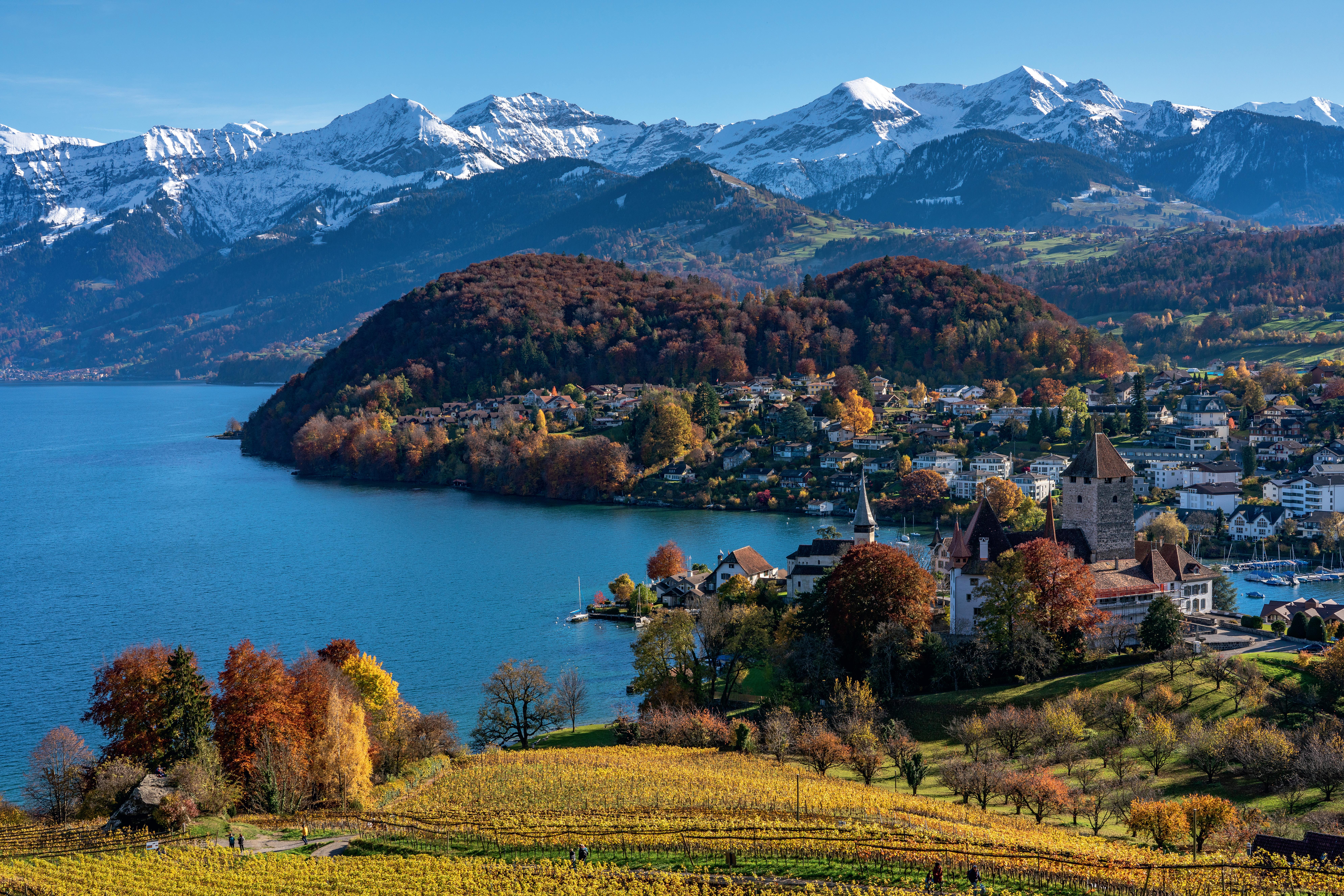Während die Spiezer Bucht in herbstlichen Farben erstrahlt, liegt auf den Bergen bereits der erste Schnee.