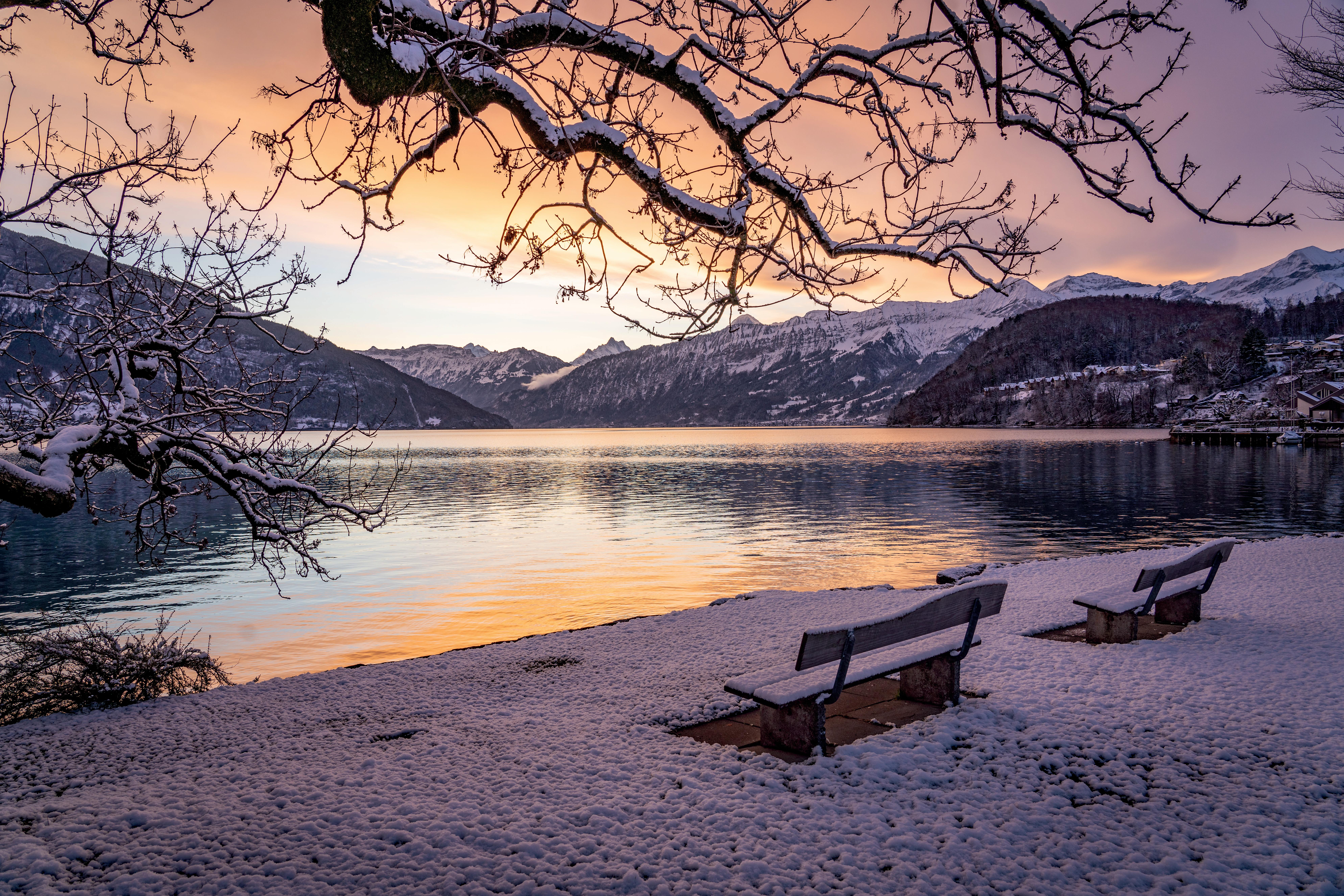 Die aufgehende Sonne färbt die Winterlandschaft in Spiez in goldenes Licht.