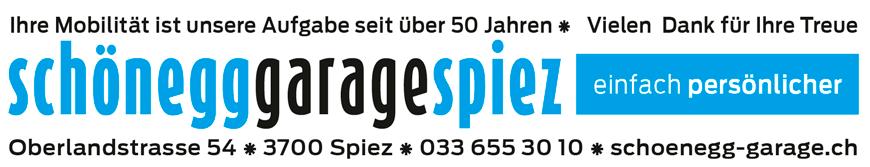 GARTEN SE RV I C E HAUSZysset+Partner AG Gartenbau+Hausservice Schlossmattstrasse 1 · 3600 Thun www.zysset-partner.ch Tel. 033 / 222 05 05Mitglied Thundasmagazin56,5x40mm Anhänger– Center Gwatt Bruno Rubi 3645 Thun– Gwatt Moosweg 30 & G. 033 3366990 P. 033 3451775 Fax 033 3361709 www.garage-rubi.ch BÖCKMANN Anhang Erster Klasse Fahrzeugbau AG Anhänger– Center Gwatt Bruno Rubi 3645 Thun– Gwatt Moosweg 30 & G. 033 3366990 P. 033 3451775 Fax 033 3361709 www.garage-rubi.ch BÖCKMANN Anhang Erster Klasse Fahrzeugbau AG ® Anhänger– Center Gwatt Bruno Rubi 3645 Thun– Gwatt Moosweg 30 & G. 033 3366990 P. 033 3451775 Fax 033 3361709 www.garage-rubi.ch BÖCKMANN Anhang Erster Klasse Fahrzeugbau AG ® Bruno Rubi 3645 Thun– Gwatt Moosweg 30 & G. 033 3366990 P. 033 3451775 Fax 033 3361709 www.garage-rubi.ch ERNST RIESEN AG Schreinerei Innenausbau Frutigenstrasse 55A CH-3604 Thun Telefon 033 336 90 66 www.riesen-ag.ch Name/Vorname Adresse PLZ / Ort E-Mail Datum Unterschrift Bestellung Bitte senden Sie mir ___ Ex. « HANS PIEREN – EIN WILLE, EIN WEG » zum Preis von je CHF 39.– (plus Porto und Verpackung CHF 7.–). ISBN 978-3-03818-405-8 Talon einsenden / faxen an: Weber Verlag AG, Gwattstrasse 144, 3645 Thun / Gwatt, Fax 033 336 55 56 oder bestellen Sie online oder per Mail: www.weberverlag.ch, mail@weberag.ch HANS PIEREN –EIN WILLE, EIN WEG Hans Pieren ist ein zielstrebiger Mann mit einem ausgeprägten Sinn für das Machbare. Seine grössten Erfolge feierte der Riesenslalom-Spezialist, nach dem er aus dem Nationalkader flog, die Skimarken wechselte und ohne Ser vicemann dastand. Er schleift und wachst seine Latten halt selbst. Egal, ob er mit Salz und Wasser aus einer butterweichen Schnee-Unterlage eine Rennpiste zaubert und so die Winter-Olympiade 2014 rettet oder kilometerlange Wasser schläuche organisiert, um den legendären Chuenisbärgli-Hang zu beschneien – «Hänsi» ist um kreative und überraschende Ideen nie verlegen. Sein eiserner Wille und seine Schaffenskraft sind im Skizirkus zur Legende geworden. Autor: Reto Koller, unter Mitwirkung von Hans Pieren 336 Seiten, 16 × 23 cm, gebunden, Hardcover Mit 200 Abbildungen. ISBN 978-3-03818-405-8 CHF 39.–Jetzt bestellen. NEU HSR Ingenieure AG Bauberatungen Spiez www hsr ingenieure ch 033 655 60 00 Bauphysik Energie Umwelt Fördergelder Café – Restaurant –Confiserie Obere Hauptgasse 76 3600 Thun Tel. 033 222 10 35 «Macht Lust auf mehr»