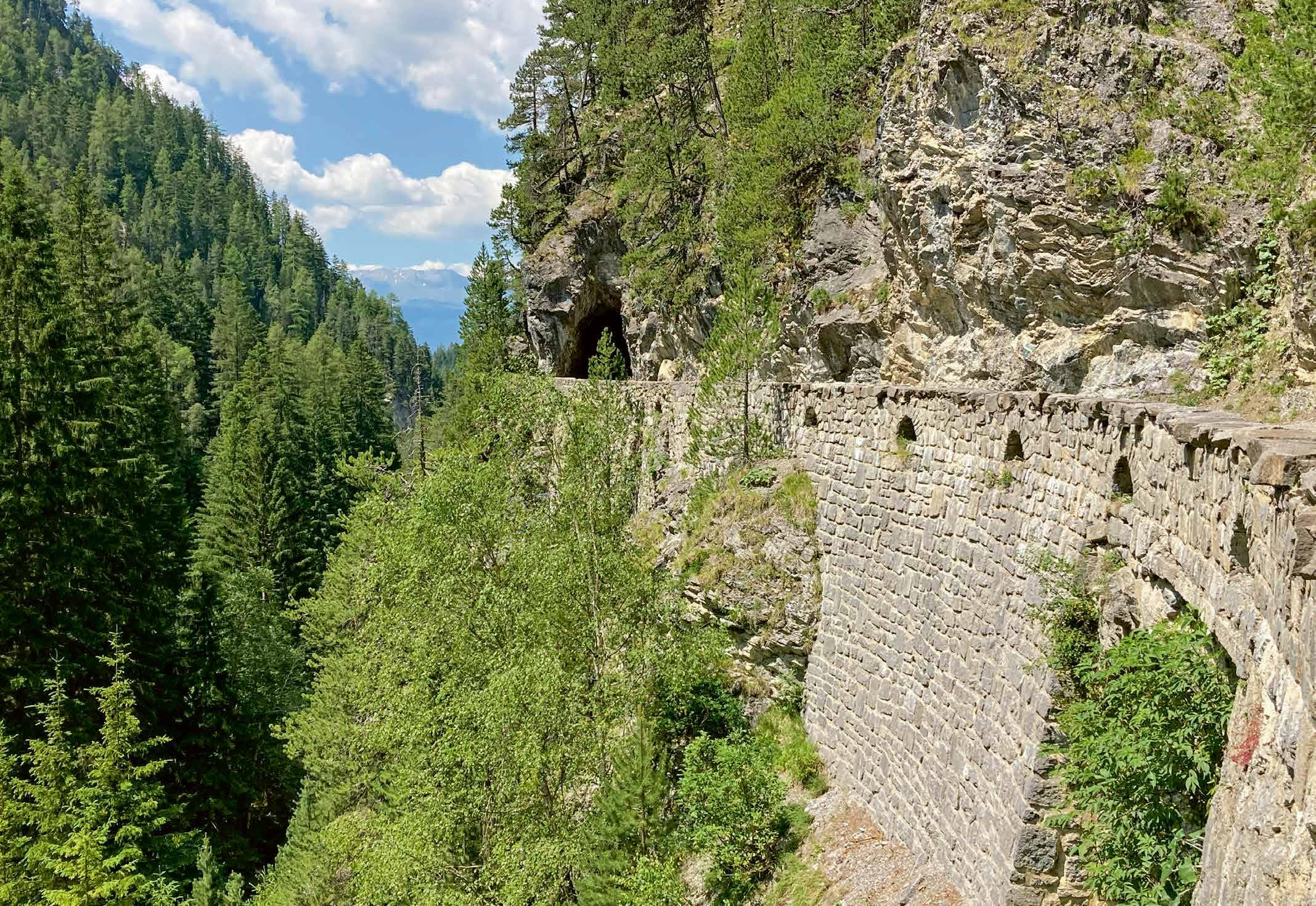 Die Chlusenstrasse ist im IVS ein Objekt von nationaler Bedeutung (BE 19.3.1). Sie ist das «Eingangstor» zum Gasterntal. Die 2,5–3 Meter breite Fahrstrasse ist mit ihren Stützmauern mit aufgesetzten Brüstungen, den gut erhaltenen Randsteinen, zwei Bogenbrücken, zwei Tunnels und einer Halbgalerie eine bautechnische Meisterleistung. Die in den Fels gehauene Anlage bietet ein spektakuläres Fahrerlebnis, das an die ersten Postkutschenstrassen erinnert. Die Chlusenstrasse ist im Privatbesitz der Bäuert Gastern. In den letzten zehn Jahren wurde die Strasse drei Mal durch Felssturz in Mitleidenschaft gezogen. Dank dem umsichtigen Umgang der Bäuert und der finanziellen Unterstützung, u. a. durch das Bundesamt für Strassen ASTRA, konnte dieses eindrückliche Strassendenkmal stets wieder fachgerecht in Stand gesetzt werden. Ab der Ausgabe 01/2024 werden wir in unserer Zeitschrift nebst dem jeweiligen Schwerpunktthema eine neue Rubrik einführen, die ein aktuelles, fachgerecht ausgeführtes IVSSanierungsprojekt wie die Chlusenstrasse vorstellt. Foto: Guy Schneider, 2023.