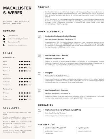 I'm Macallister Weber, an architectural designer with three years of experience, dedicated to crafting sustainable, reliable, and enduring designs. Since graduating, I’ve quickly progressed from conceptual and schematic design to overseeing and executing complete architectural projects.