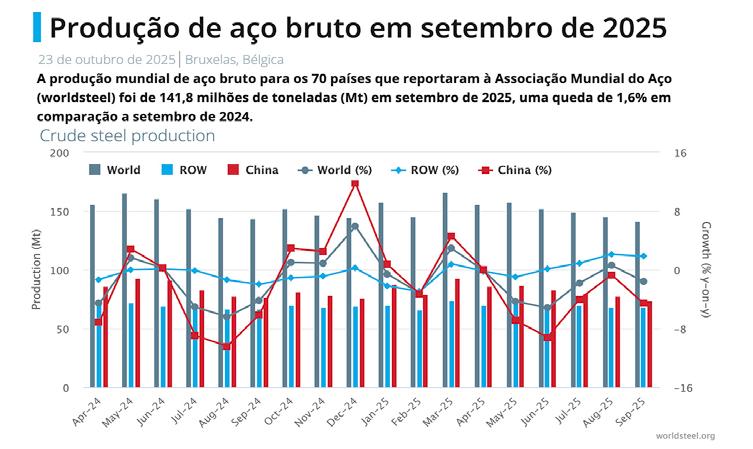 Segundo a Worldsteel Association, a produção mundial de aço bruto totalizou 141,8 milhões de toneladas em setembro de 2025, representando uma queda de 1,6% em relação ao mesmo mês de 2024.