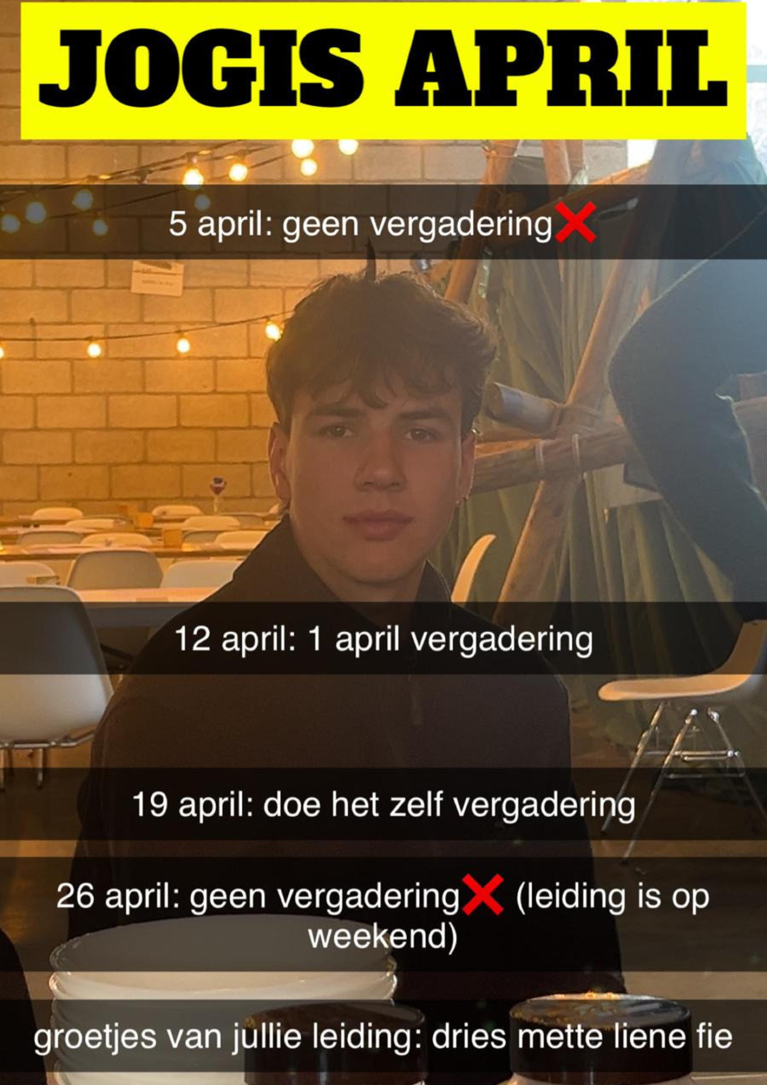 - Wij willen jullie er nog eens aan herinneren dat er op 5 april geen scouts zal zijn wegens Pasen. Daarnaast zal er ook op 26 april geen scouts zijn wegens leidingsweekend. De vergaderingen gaan wel door op 12 april en 19 april.
