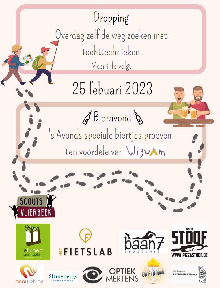 Na de dropping kan je genieten van een verfrissend biertje op onze bieravond ten voordele van WigWam. De bieravond zal door gaan in het ontmoetingscentrum het Genadedal. Laat je deze avond verleiden door een brede selectie aan bieren die u kan komen proeven. De Vlierbeekse leidingsploeg zal u tijdens deze gezellige avond bedienen.