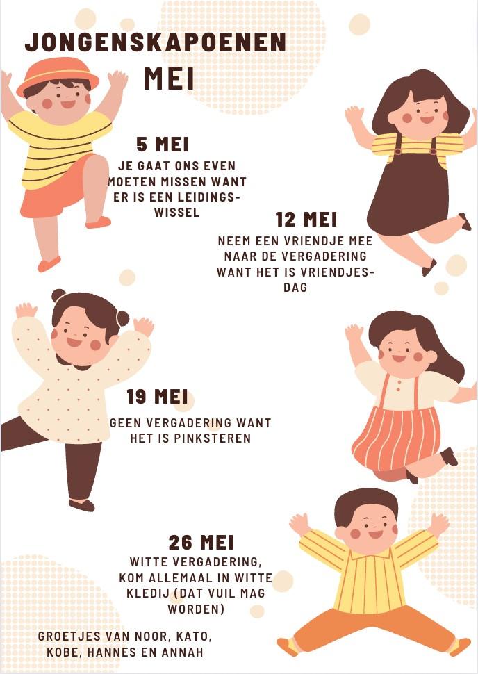 Op 19 mei is het helaas geen vergadering voor kapoenen, kawellen, vowo’s en jonggivers omwille van Pinksteren!