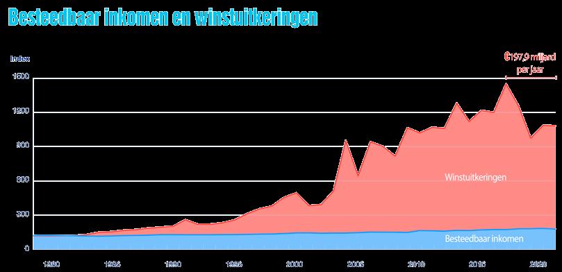 Tussen 1980 en 2021 werd het besteedbare inkomen in Nederland slechts 1,63 maal hoger. In dezelfde tijd stegen de aandeelhoudersuitkeringen met een factor 10,9. In 2022 kregen aandeelhouders samen €182,7 miljard uitgekeerd. Bron: CBS en berekeningen WBSP