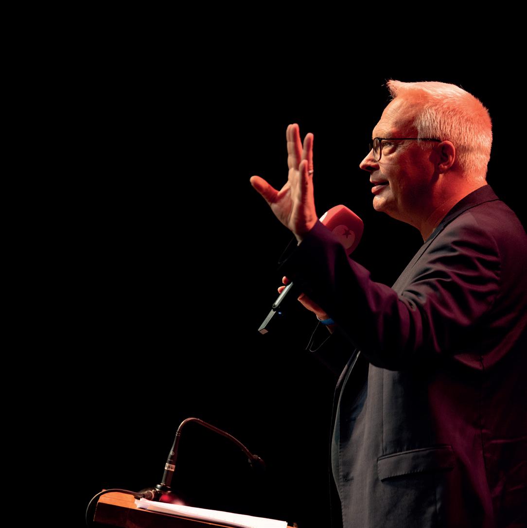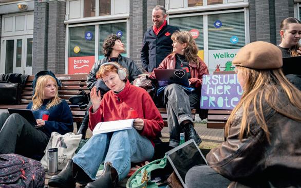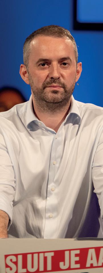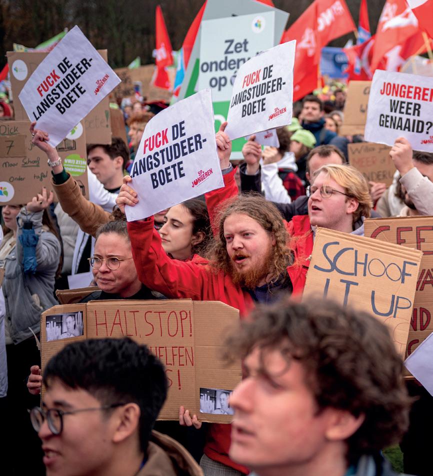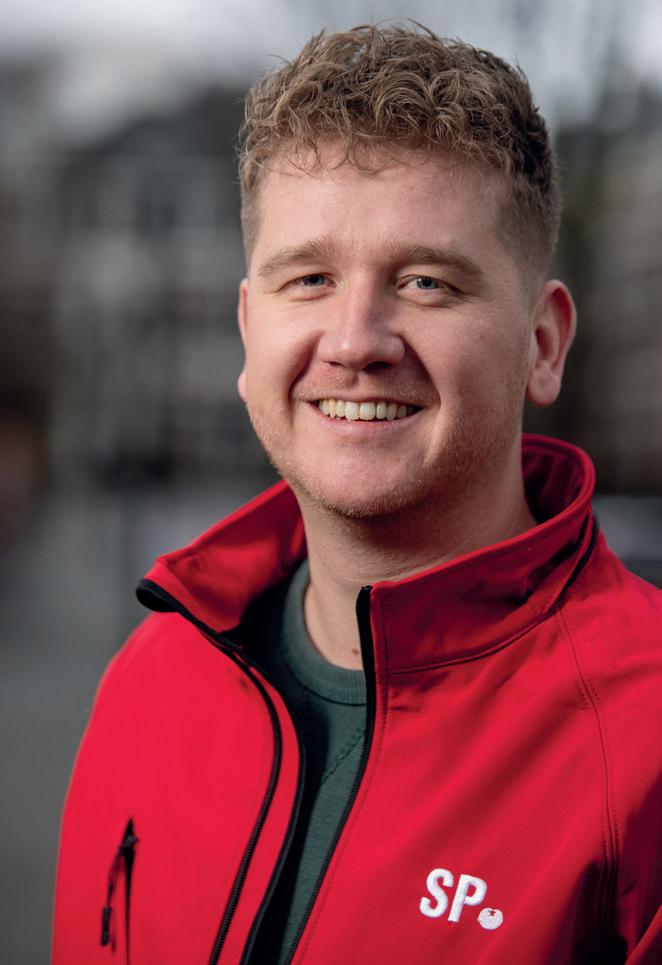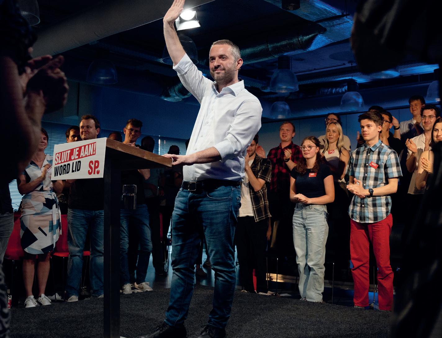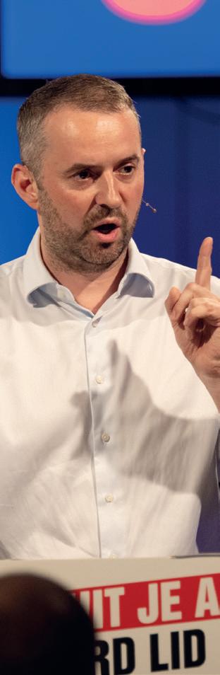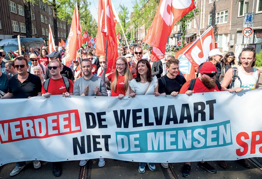 gels over hen uitstort. Natuurlijk is het spannend om als SP daarbij aanwezig te zijn. Soms hoor je dan dingen die rechtstreeks overgenomen zijn van een Wilders en waar je nekharen overeind van gaan staan. Daar moet je dan echt even doorheen. Maar we moeten er wel bij zijn, om te luisteren en om er scherpe analyses van te kunnen maken, volgens de massalijn zoals we dat binnen de SP noemen.’ Stap twee is volgens Dijk het smeden van nieuwe allianties: ‘Vervolgens moeten we tegen deze mensen zeggen: ‘Zullen we op basis van deze klassenanalyse samen de strijd aangaan?’ Dan haal je de meest kritische massa in zo’n groep naar je eigen kant. Nu gebeurt dat nog te weinig. Bij de boerenprotesten bijvoorbeeld wordt die kritische massa door de agro-industrie gekaapt. Die agro-industrie-jongens zitten in hun handjes te wrijven en denken: ‘Wij hoeven geen biet te doen, die radicale boeren halen de hete aardappels voor ons uit het vuur.’ Kortom, als wij niet daarbij aanwezig zijn, dan verliezen wij dat, steeds weer. Of het nou gaat om kleine ondernemers, of mensen met een flexcontract, of boeren, het resultaat is dat we steeds tegenover hen staan, terwijl dat volstrekt onnodig is.’ Kortom, alleen door héél de werkende klasse te verenigen, inclusief de kleine zelfstandigen, kunnen we een vuist maken tegen de afbraakpolitiek van rechts, die in dienst staat van de grote bedrijven en superrijken. ‘Daarom’, zo sluit Dijk zijn toespraak af, ‘is er een partij nodig die samen met vakbonden compromisloos opkomt voor heel de werkende klasse, een échte partij voor de arbeid. Die partij is er, dat is de SP.’ <