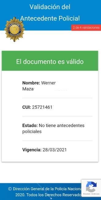 2. Ingresando a la página web policiales.pnc.gob.gt/validacion utilizando el código de verificación que aparece en la parte superior derecha y en el pie de página de la Certificación del Antecedente Policial en Línea.