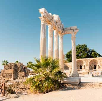 Aan de Turkse Rivièra duik je letterlijk de Oudheid in en komt de geschiedenis tot leven. Zo kun je in Side de Tempel van Apollo bewonderen en het antieke theater bezoeken dat ooit plaats bood aan duizenden toeschouwers. Patara, bekend als de geboortestad van Sint-Nicolaas, combineert een uitgestrekt strand met historische charme. Hier staat ook de kerk van Sint-Nicolaas, die een mooi voorbeeld is van de Byzantijnse architectuur. Op slechts 45 kilometer van Antalya ligt Aspendos, beroemd om het best bewaarde Romeinse theater van Anatolië en de hele Middellandse Zee. Het theater wordt nog steeds gebruikt voor voorstellingen en festivals, waardoor het verleden op unieke wijze tot leven komt. Hoog in de bergen ligt Sagalassos, een stad uit de Romeinse tijd met een indrukwekkend amfitheater voor 9.000 bezoekers en goed bewaarde stadsmuren, tempels en badhuizen. Andere culturele highlights zijn het oude Myra met zijn beroemde rotsgraven en het archeologische complex Xanthos en Letoon dat op de UNESCO Werelderfgoedlijst staat.