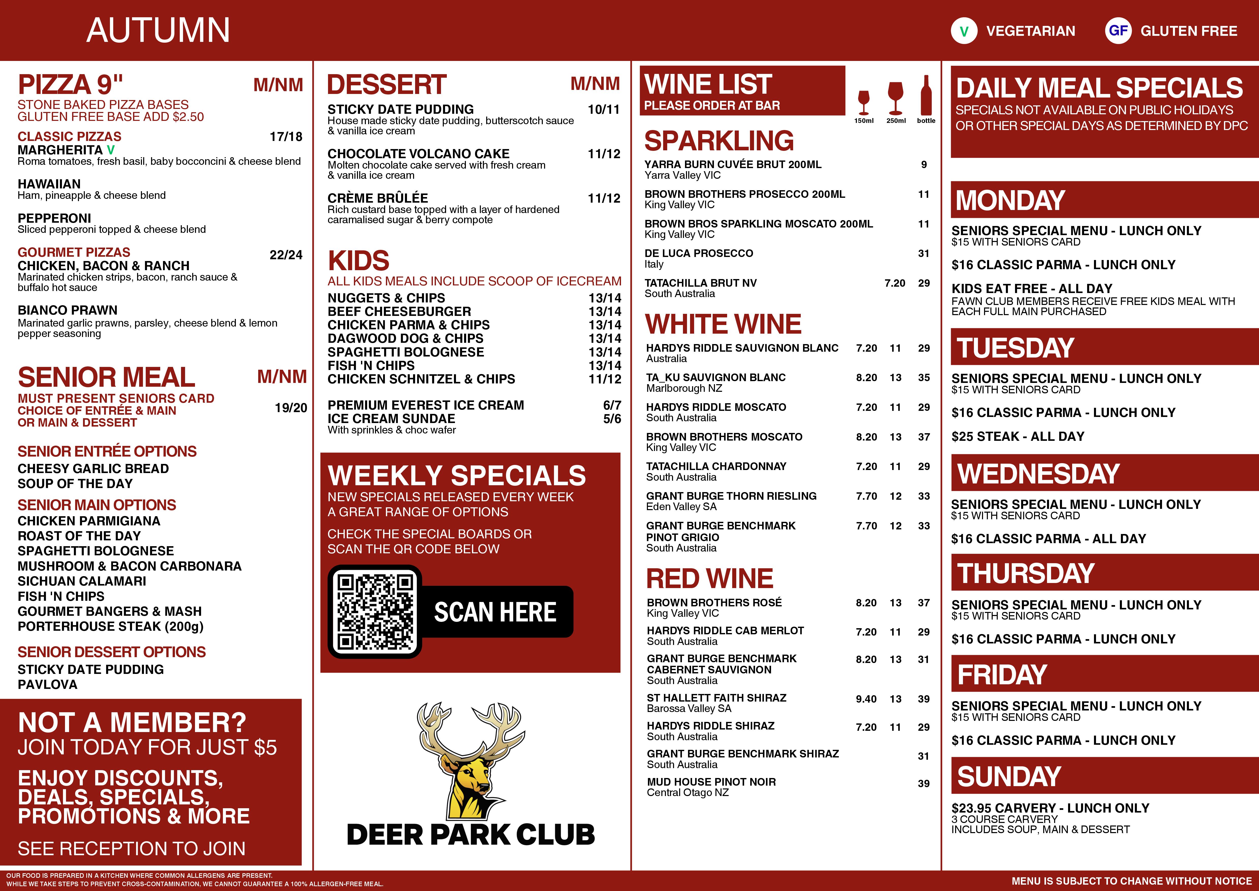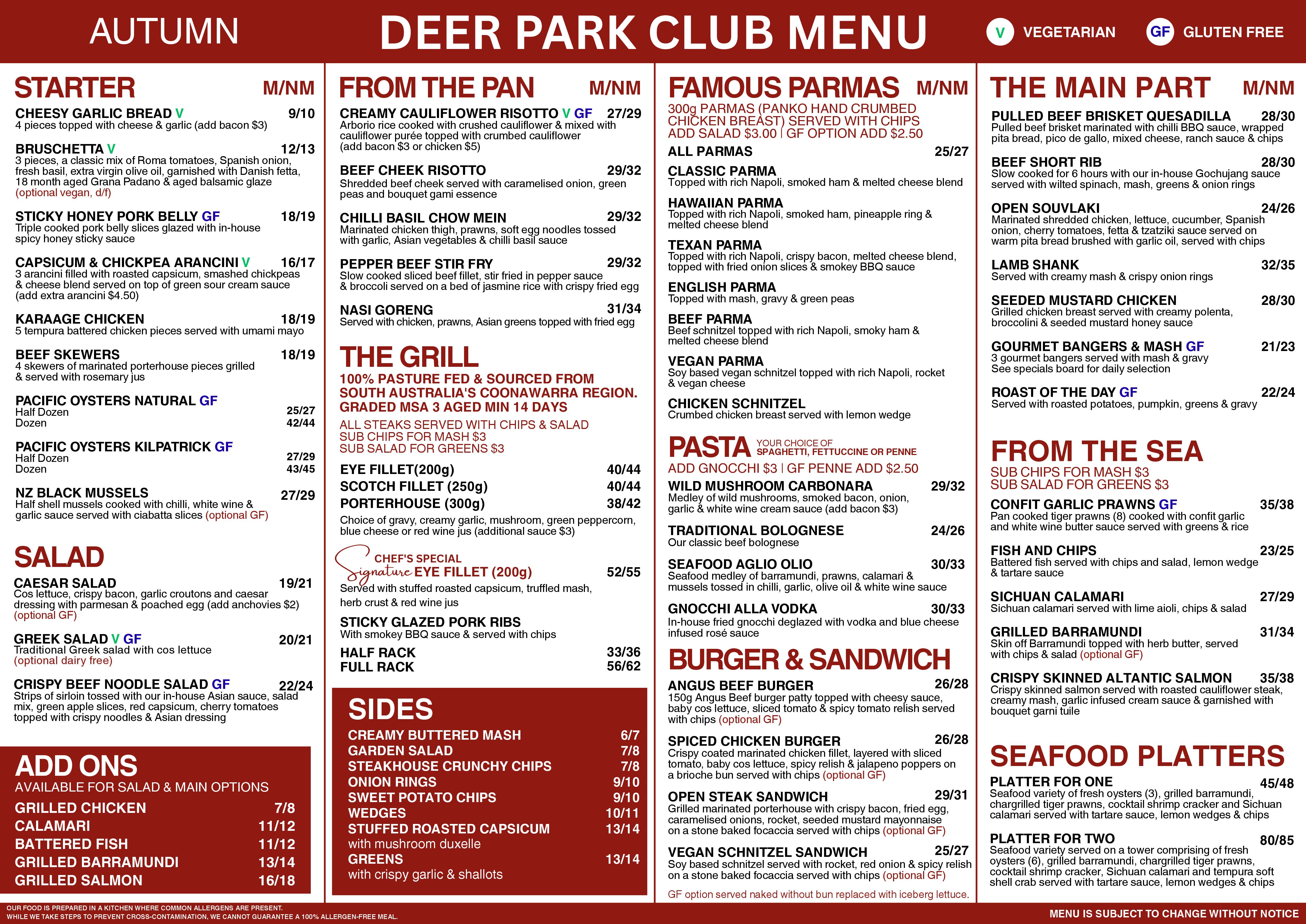 Deer Park Club Autumn Menu 2025