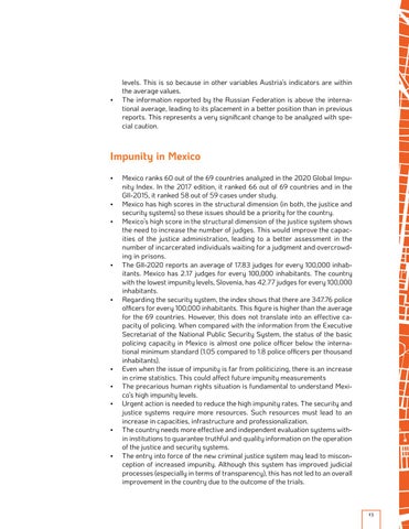 Mexico ranks 60 out of the 69 countries analyzed in the 2020 Global Impunity Index. In the 2017 edition, it ranked 66 out of 69 countries and in the GII-2015, it ranked 58 out of 59 cases under study. Mexico has high scores in the structural dimension (in both, the justice and security systems) so these issues should be a priority for the country. Mexico’s high score in the structural dimension of the justice system shows the need to increase the number of judges. This would improve the capacities of the justice administration, leading to a better assessment in the number of incarcerated individuals waiting for a judgment and overcrowding in prisons. The GII-2020 reports an average of 17.83 judges for every 100,000 inhabitants. Mexico has 2.17 judges for every 100,000 inhabitants. The country with the lowest impunity levels, Slovenia, has 42.77 judges for every 100,000 inhabitants. Regarding the security system, the index shows that there are 347.76 police officers for every 100,000 inhabitants. This figure is higher than the average for the 69 countries. However, this does not translate into an effective capacity of policing. When compared with the information from the Executive Secretariat of the National Public Security System, the status of the basic policing capacity in Mexico is almost one police officer below the international minimum standard (1.05 compared to 1.8 police officers per thousand inhabitants). Even when the issue of impunity is far from politicizing, there is an increase in crime statistics. This could affect future impunity measurements The precarious human rights situation is fundamental to understand Mexico’s high impunity levels. Urgent action is needed to reduce the high impunity rates. The security and justice systems require more resources. Such resources must lead to an increase in capacities, infrastructure and professionalization. The country needs more effective and independent evaluation systems within institutions to guarantee truthful and quality information on the operation of the justice and security systems. The entry into force of the new criminal justice system may lead to misconception of increased impunity. Although this system has improved judicial processes (especially in terms of transparency), this has not led to an overall improvement in the country due to the outcome of the trials.