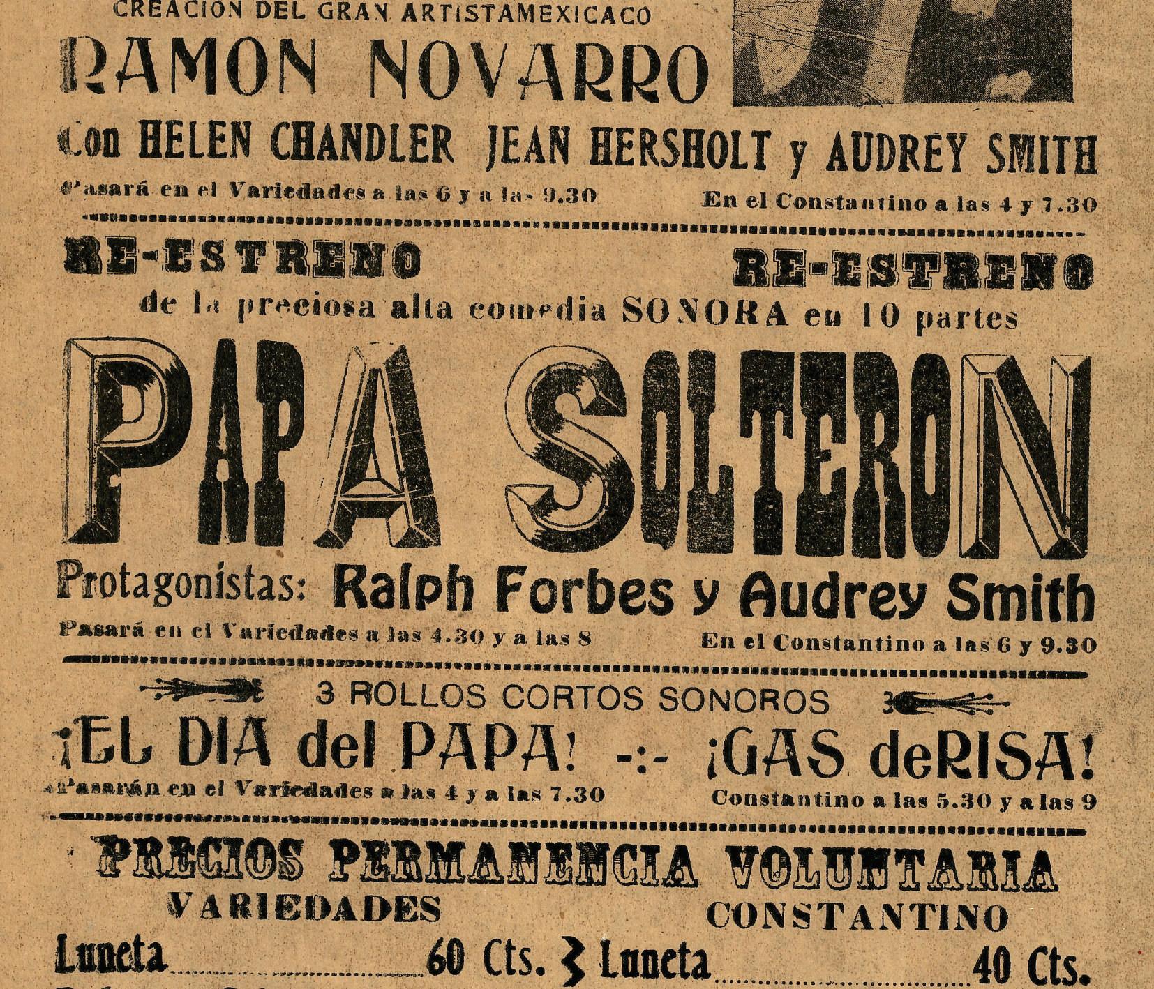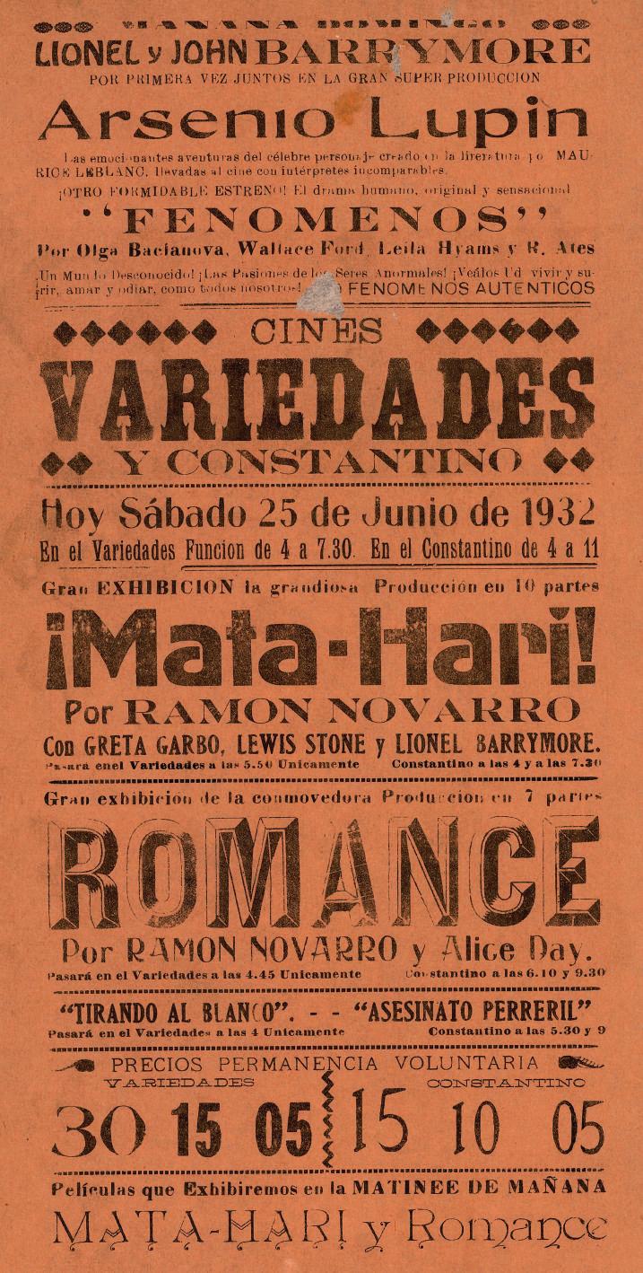 Cartelera del Teatro Constantino, que anuncia el estreno de la cinta Los sentimentales y la culminación de la serie El misterio silencioso.