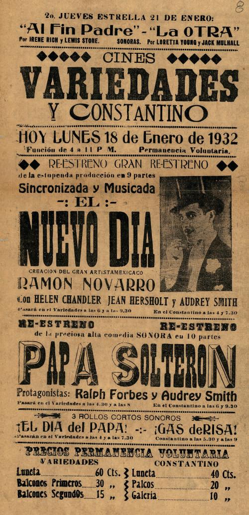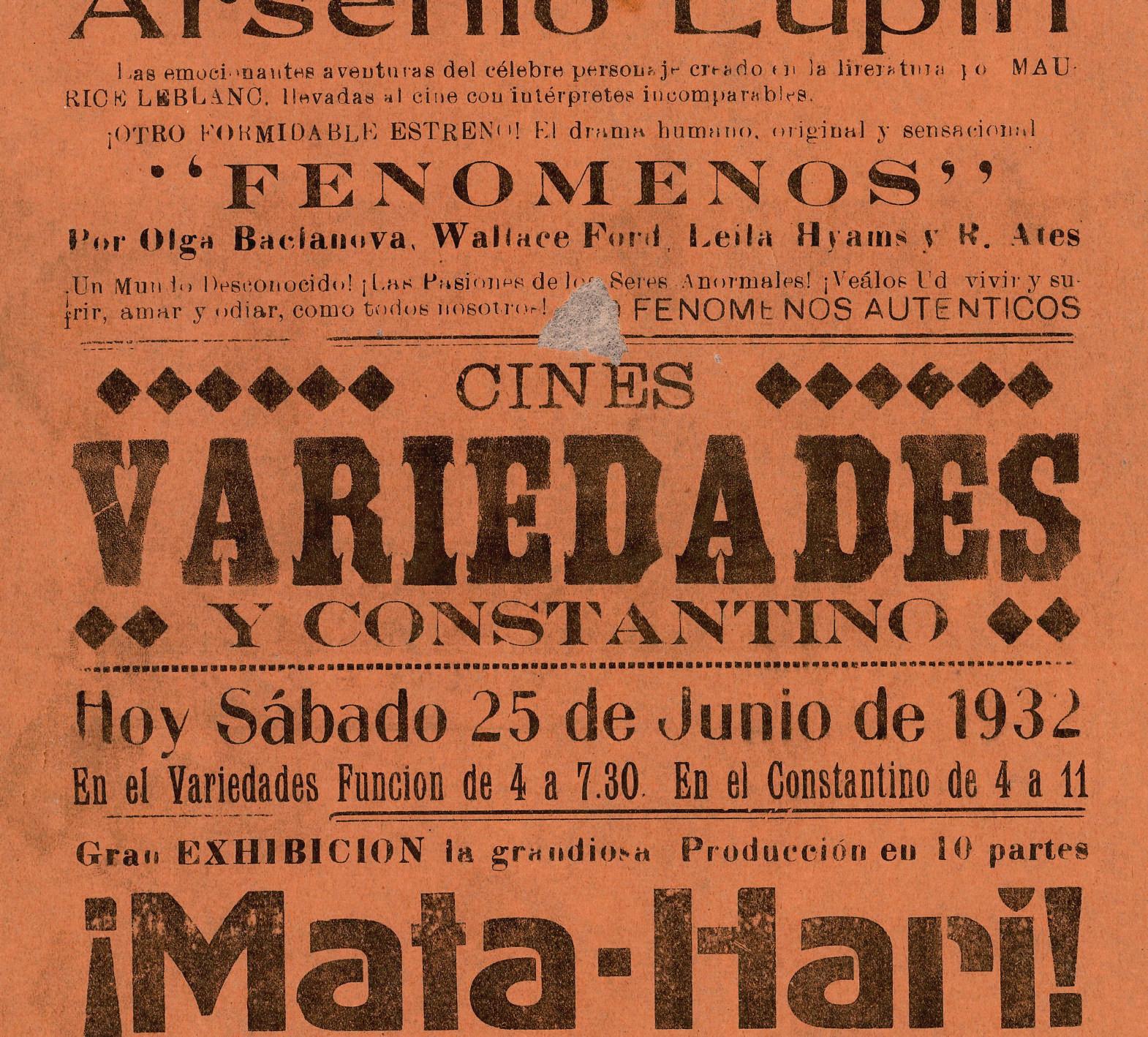 Cartelera del Teatro Constantino que anuncia el estreno de La victoria del impostor y la continuación de la serie El misterio silencioso.