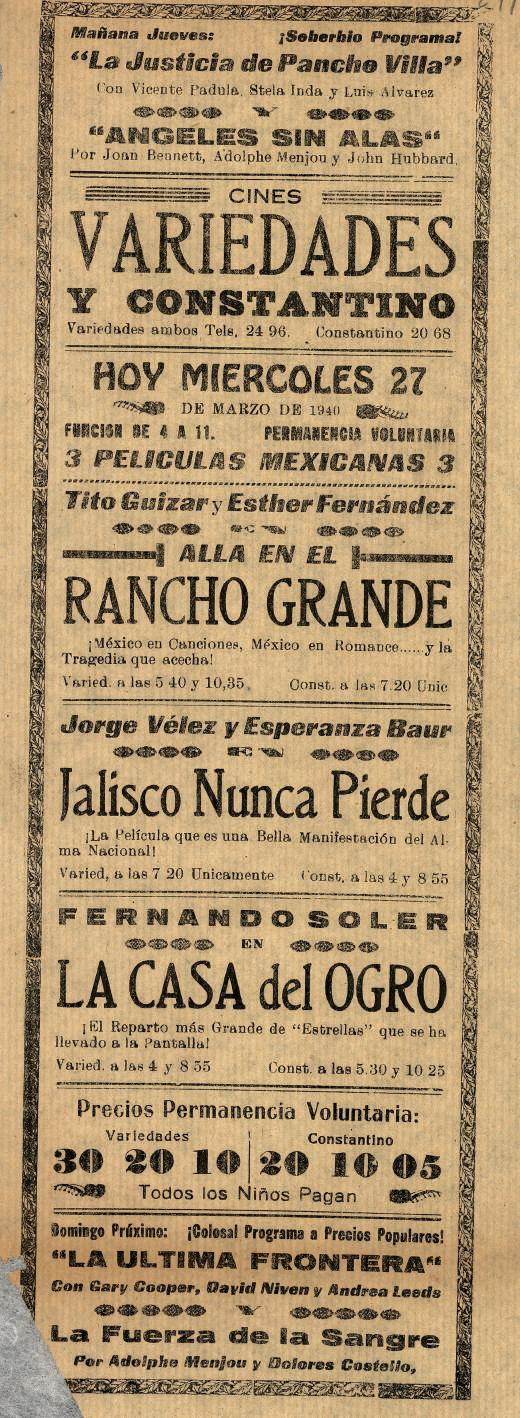 agmp. Expedientes, vol. 1034, fs. 277–279, año 1941 Comisión(es) de Gobernación: Amparo núm. 293/941 del Juzgado Segundo de Distrito en el Estado, promovido por Jaimes Rodolfo J. y otros contra actos de la Comisión de Gobernación del H. Ayuntamiento de esta capital, consistentes en haber puesto que se prohibiera la venta de golosinas en los cines y teatros durante el desarrollo de los espectáculos.