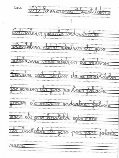 Txikitan beti eskaiola bat jartzea desiratzen nuen. Egun batean, eskolan azterketa zail bat egin ostean, 6.mailako guztioak korrika jaitsi ginen denok patiora futbolera. Korrika ari nintzela erori eta min handia hartu nuen. Etxera heldu nintzenean, amak, hanka ukitu eta aitari handi-handi neukala esaten entzun nuen. Orduan, medikuarengan eraman ninduten. Han mediku bat bata txuri batekin gerturatzen zitzaildala ikusi nuen. Berak Inge Mendizabal ohikatu zuen, oiartzuna egin zuela iruditu zitzaidan. Berarekin joateko eskatu zidan eta berehala radiografia egin zidaten. Radiografia horretan hanka hautsita nuela esan zidaten eta laster batean operatu behar nindutela. Ebakuntza oso ondo joan zela esan zidan medikuak, momentu batan nerbio bat ukitu zutela eta konplikazio batzuk egon zirela baina dena ondo atera zela. Oso nekatuta nengoen, horregatik kutxa bat oparitu zidaten, bertan “ireki” jartzen zuen. Ireki ostean oso gustura geratu nintze nire jolas gustukoenak zeudelako. Lokuluxka bat egin ondoren, gose handiz esnatu nintzen, baina ekarri zuten bazkariak logelan utzi zuen kiratsarekin jateko gogoa joan zitzaida. Azkenik heldu zen etxera joateko eguna. Lehenengo amonaren etxean gelditu ginen, horiek bai makarroi goxoak. Handik etxera joan ostean ohean etzan nintzen eta segundu bat igarotzerako lo gelditu nintzen. Berriro eskolara hasi nintzenean igogailua erabiltzen nuen patiora jeisteko eta patiotik igotzeko. Errekuperazioa zaila izan zen. Egunero amari esaten nion: - Ama, ez dut ulertzen txikitan zergatik nahi izaten nuen eskaiola bat izatea!