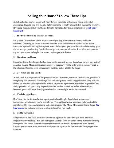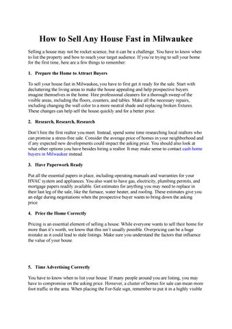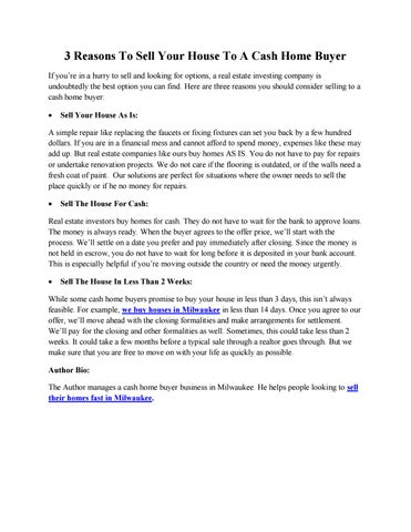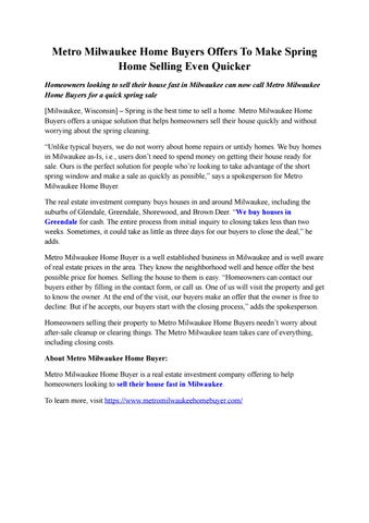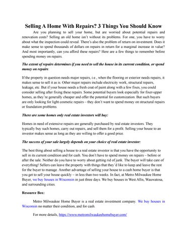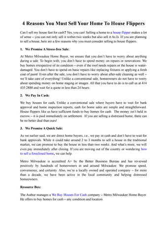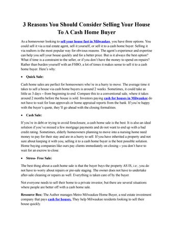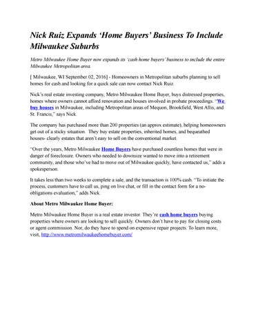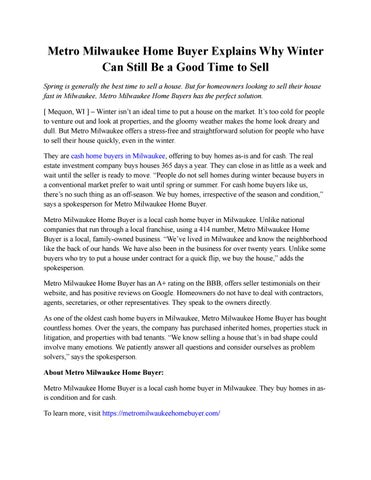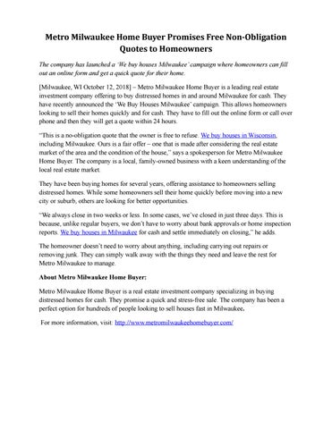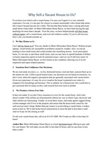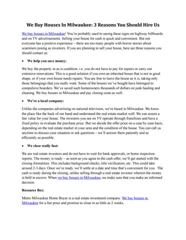 Metro Milwaukee Home Buyer is a local family owned business. We buy houses in Milwaukee in ‘as is condition’ and promise to close the sale in 2 weeks (sometimes even less). You may be looking to sell your house to avoid a foreclosure, or to unlock equity from probate property - your motive does not matter. We aren’t real estate agents, but investors. You don’t have to worry about long drawn out bank loan approvals. We pay in cash and take care of everything. You don’t have to pay for repairs, or lift a finger to clean the house. And you don’t have to deal with junk haulers. You can really leave the house AS IS - just take the things to need and leave the rest to us to clean. The process is really simple - call us and we’ll come over to take a look at the house. We’ll make a fair priced offer. If you agree, we’ll close the deal in 2 weeks.