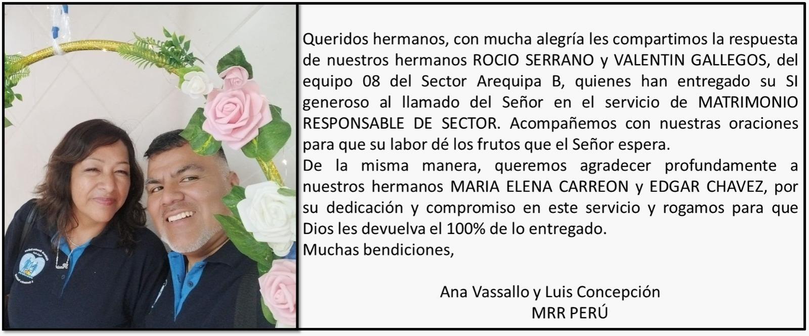 En noviembre del 2022 en horas de la noche cuando estábamos pensando reunirnos para la elección del nuevo MR de equipo N° 24 a quienes íbamos entregar el cargo por haber cumplido nuestro servicio, nos sorprendió una llamada de Carlos y Norma MRR Perú, para proponernos un hermoso regalo de Dios. La generosidad del Señor había sido tan grande, por segunda vez fuimos privilegiados en poco tiempo de estar en los Equipos de Nuestra Señora, nos informaron que Dios había puesto sus ojos en nosotros para el servicio como MRS, inmensa alegría a la vez el miedo invadía nuestros corazones queriendo confundirnos, preguntándonos: ¿ Por qué nosotros?,