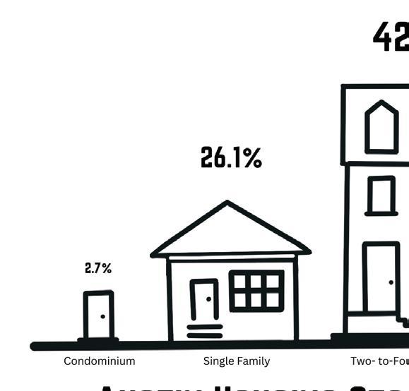 On the West Side, each community has a unique housing stock composition. Singlefamily homes make up 26% of the housing in Austin, which is on par with the city average. But it has a higher percentage of two- to-four-flats than Chicago overall.
