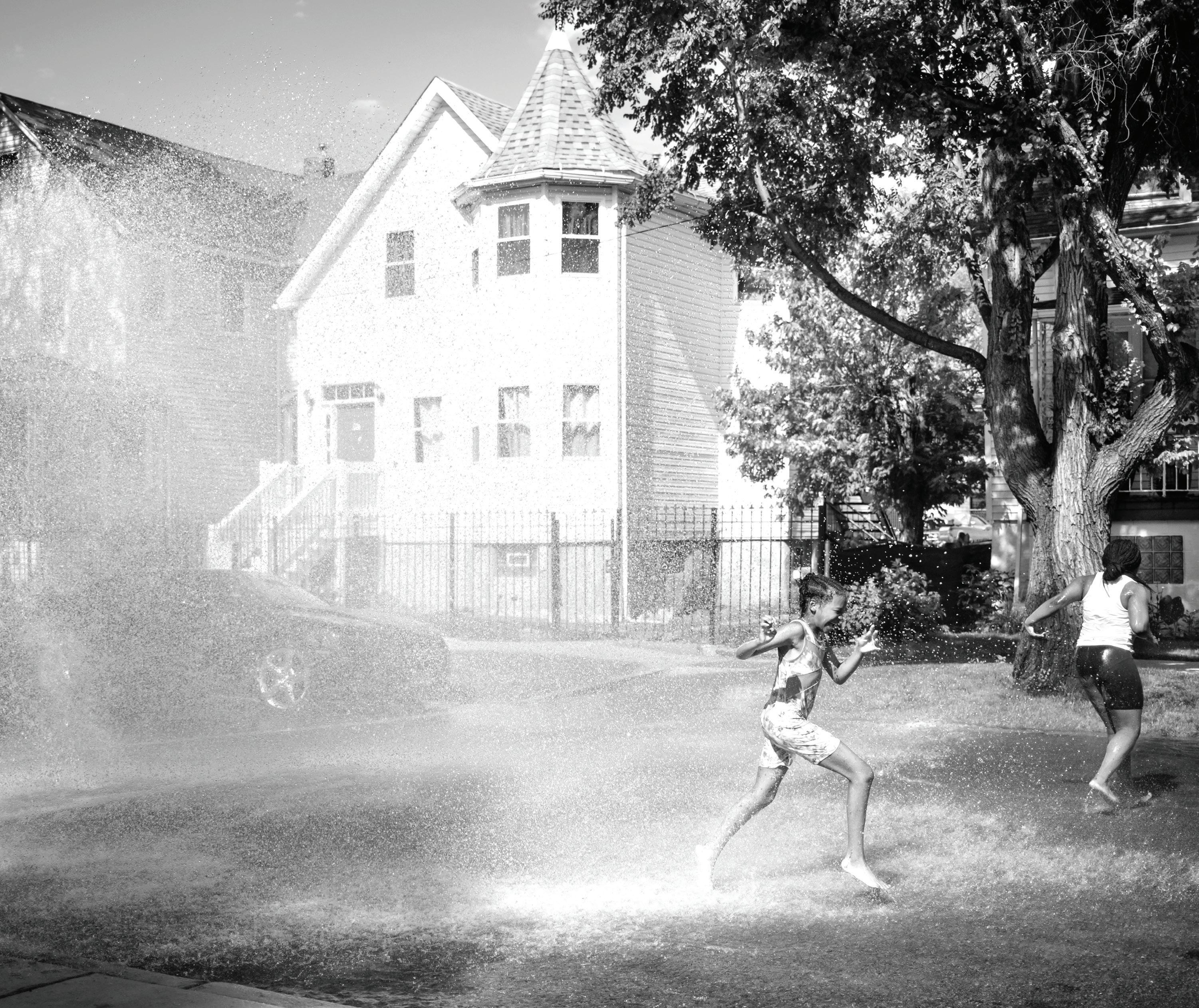 SPLASH , CHIC AG O ’S WESTSIDE, 2024: Children play on a hot summer day, running through sprinklers and chasing laughter across the street.