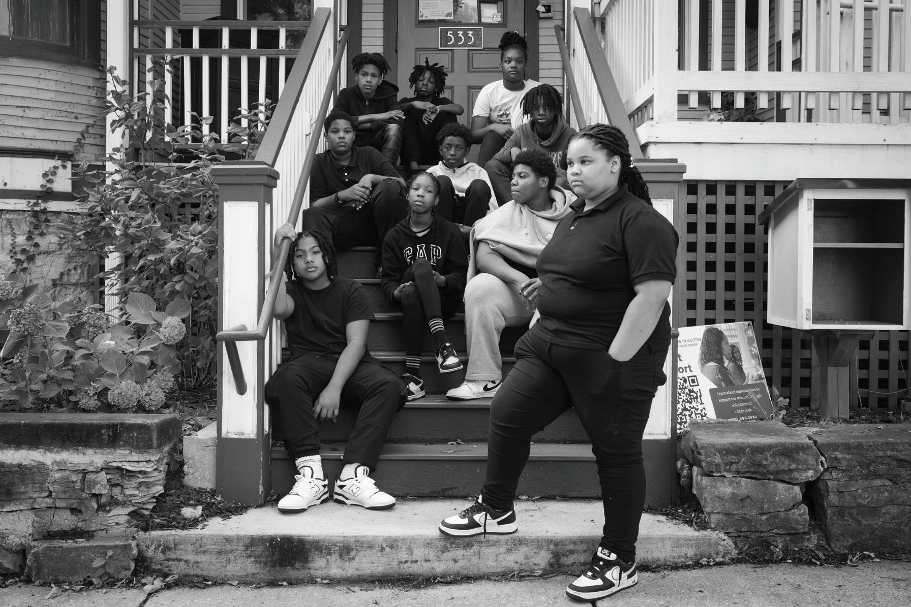A HOUSE IN AUSTIN, CHICAG O ’S WESTSIDE, 2024: is photograph shows a group of students from Nash Elementary School sitting in front of the building that houses A House In Austin.