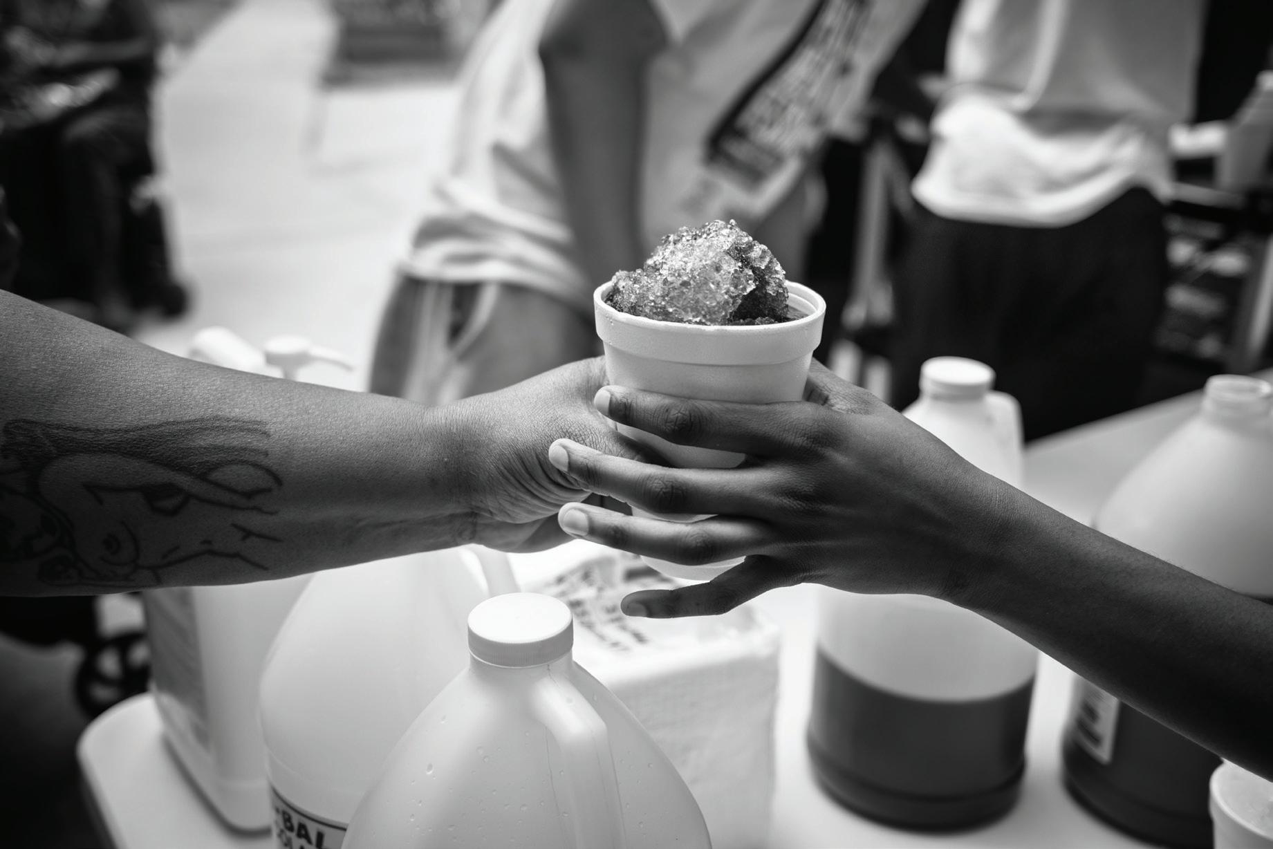 SNOW CONES, CHIC AG O ’S WESTSIDE, 2024: One person hands a snow cone to another on a warm day, a simple act of care and connection.
