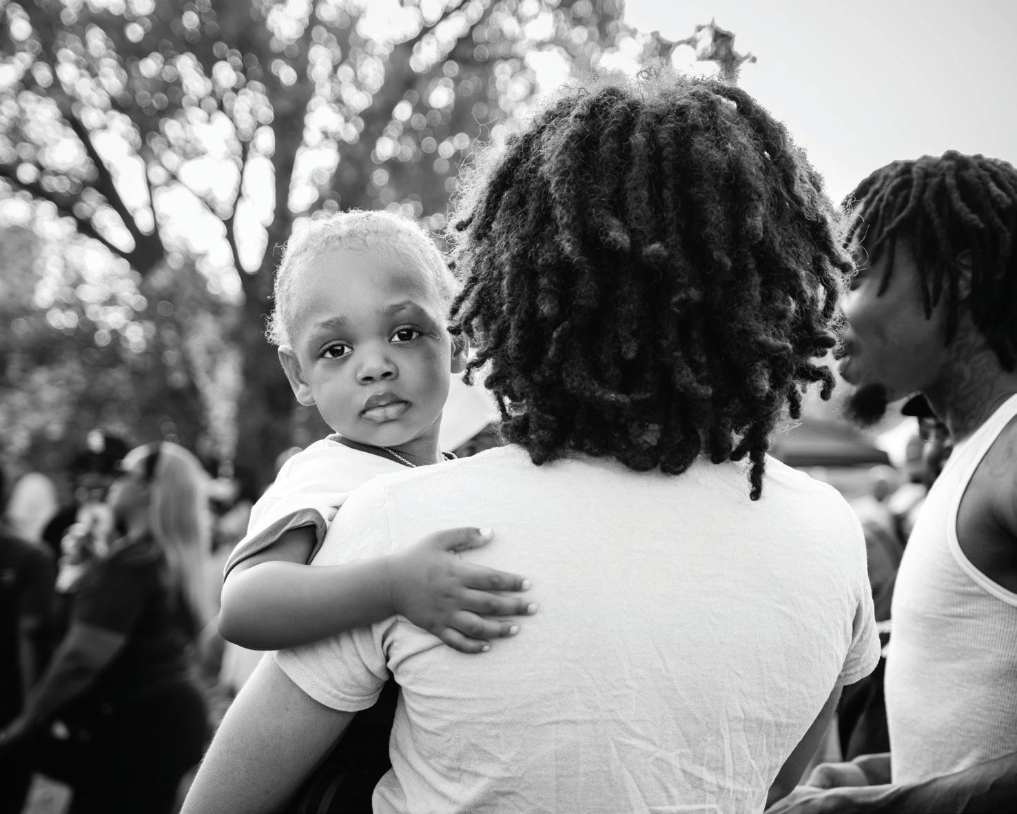 SUN SHINE, CHIC AG O ’S WESTSIDE, 2024: is photograph was made at the Marshall High School All-Class Reunion. A young boy holds a family member closely, his body pressed into their arms, taking in the energy of the celebration