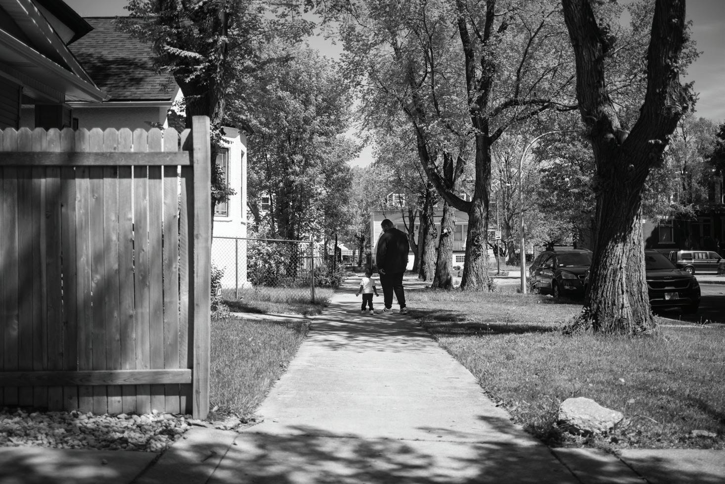 BIG & LIT TLE RALPH GO FOR A WALK , CHIC AG O ’S WESTSIDE, 2024: A father and son walk together, their steps in rhythm with each other and the street around them.