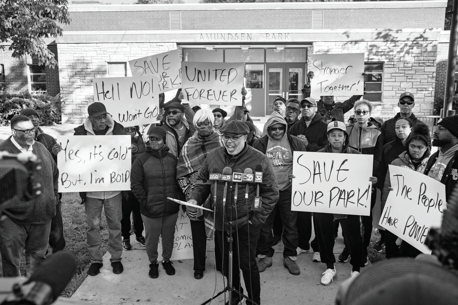 SAVING OUR PARK , CHIC AG O ’S WESTSIDE, 2023: Westside residents rallied to protect Amundsen Park from a proposal to conver t it into a temporar y migrant shelter.