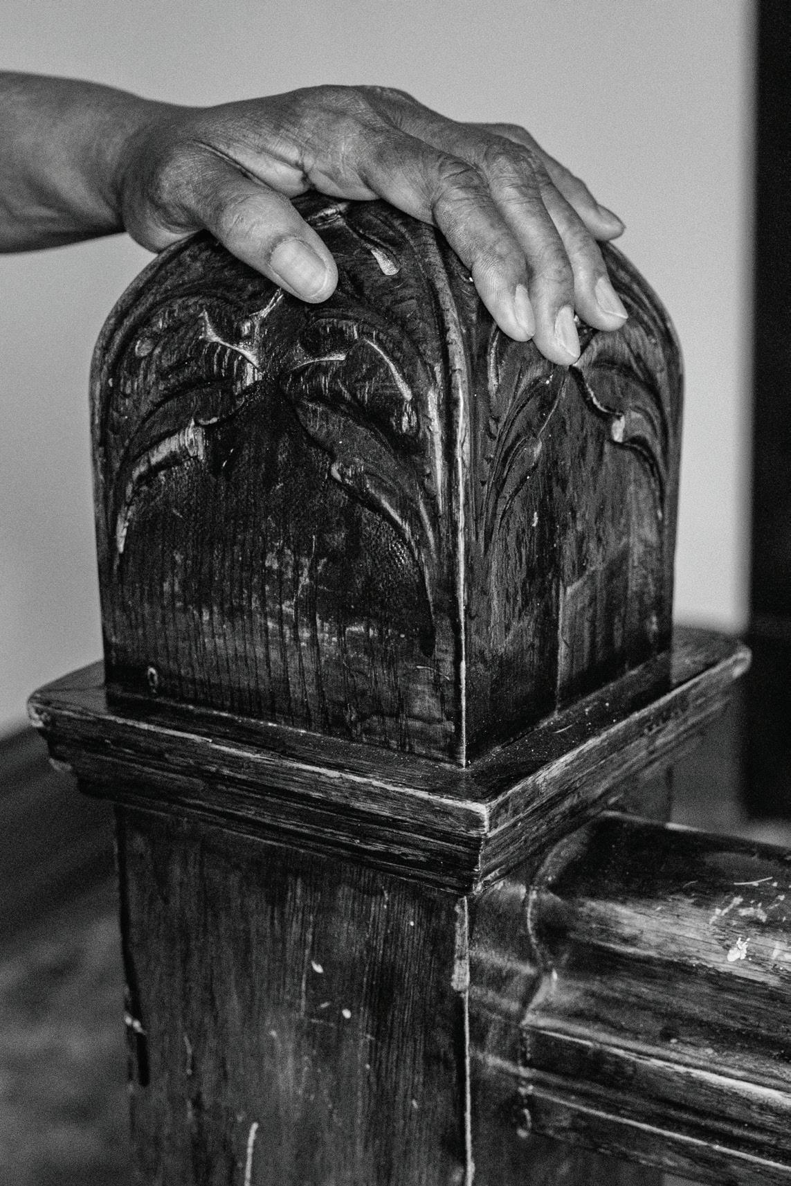 HOLDING HISTORY, CHIC AG O ’S WESTSIDE, 2024: Inside a woman’s home, a hand rests along a worn staircase banister.