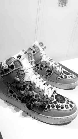 “The first pair I designed at Fleurotica at Garfield Park Conservatory and my model actually wore them in the show in October. I wanted to create something for that outfit using real flowers, so all the flowers are hand-pressed, dried, and applied to the shoe,” Rodden said. “After I shared that pair, I received interest from people who wanted their own. The rose pair was a custom order I made for someone, and they’ll receive them after the show.” Rodden became involved with Third City Studios shortly after it opened in October, as she was looking for a space where her students could showcase their work