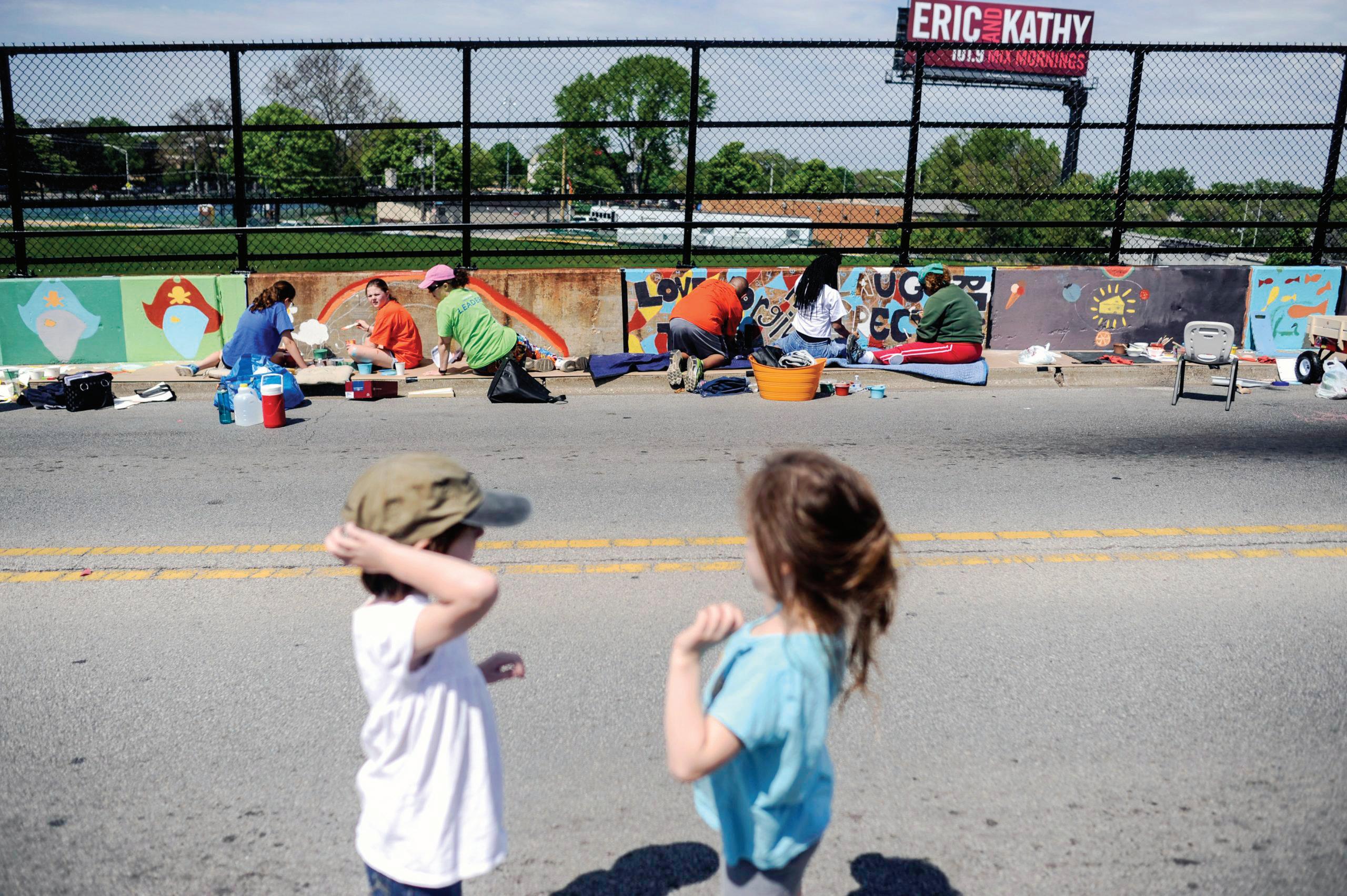 Th at May, around 300 p eople showe d up to paint over 100 p anels of the bridg e. Gi rl and boy scout troops, the Fo rest Pa rk Public L ibrary, the Kiwanis C lub of Fo rest Pa rk , Pa rk District of Fo rest Pa rk , District 91 schools, p lus local businesses and f amilies showe d up to pain t images of l ife in Fo rest Pa rk , fl owers and artwork of civic movements. Ro zmus said one person even hosted their birthd ay pa rt y on the bridg e, inviting friends to join in contributing to a mural.