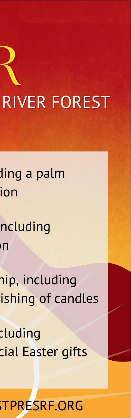 Friday, March 22, 6:30 – 8:30 p.m., Park District of Forest Park, Soccer Field Bring your ashlights and baskets and get ready for an “egg-citing” late night egg hunt. Eggs lled with special treats and prizes will be hidden throughout the Park Distric t. Find the golden egg and receive an ex tra cool prize. Register at fppl.org.