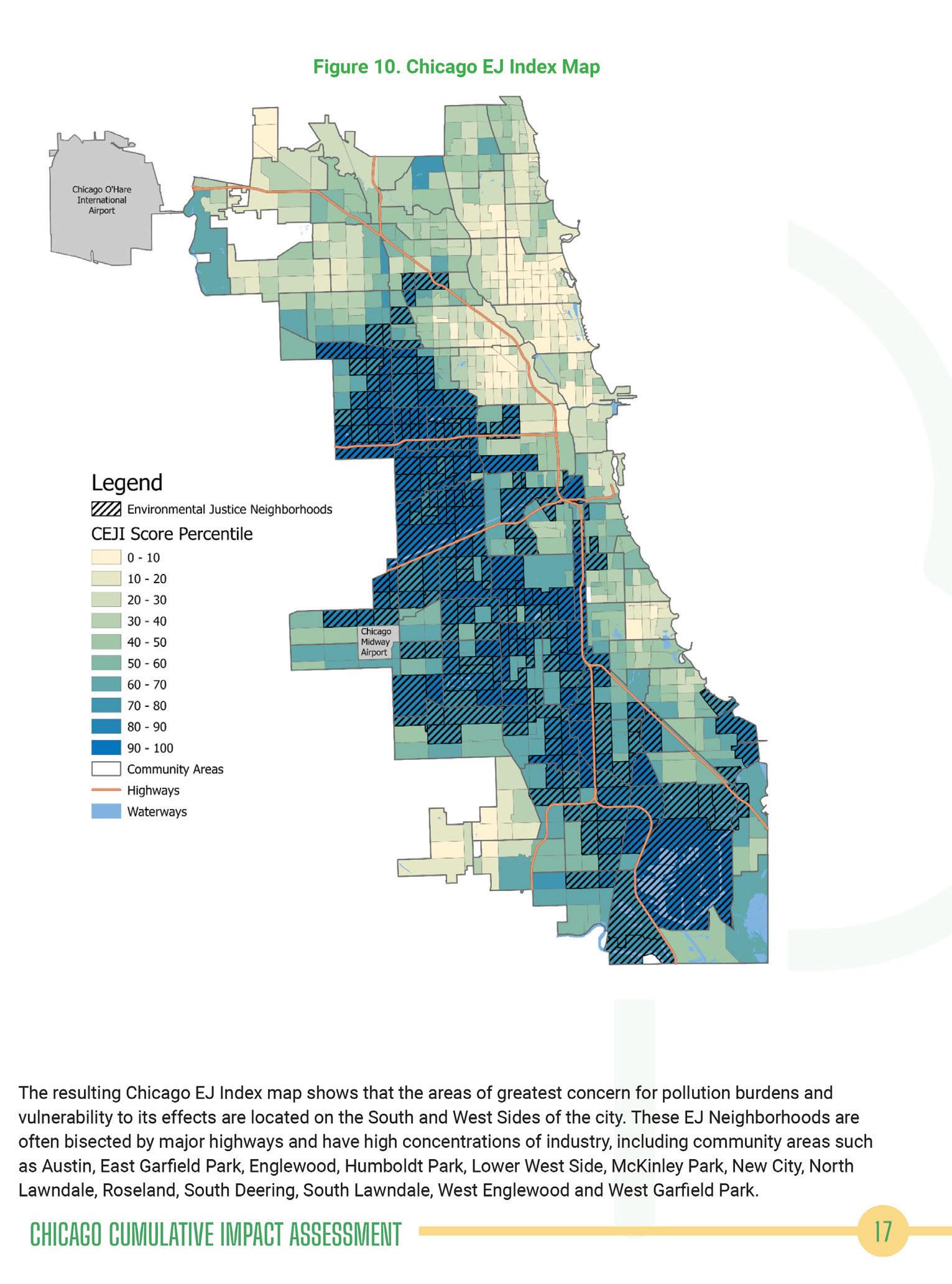 e resulting Chicago EJ Index map shows that the areas of greatest concern for pollution burdens and vulnerability to its e ects are located on the South and West Sides of the city. ese EJ Neighborhoods are o en bisected by major highways and have high concentrations of industry, including community areas such as Austin, East Gar eld Park, Englewood, Humboldt Park, Lower West Side, McKinley Park, New City, North Lawndale, Roseland, South Deering, South Lawndale, West Englewood and West Gar eld Park.