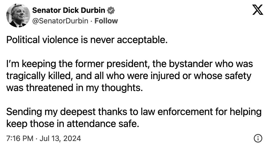 As info rm ation c ontinues to c ome from investi gators over the assassination attempt of for mer Presid ent Donald Trump, the GOP’s c andidate for the 2024 presidential election, I llinois lawmakers and p oliticians are we ighing in on Saturday’s shooting