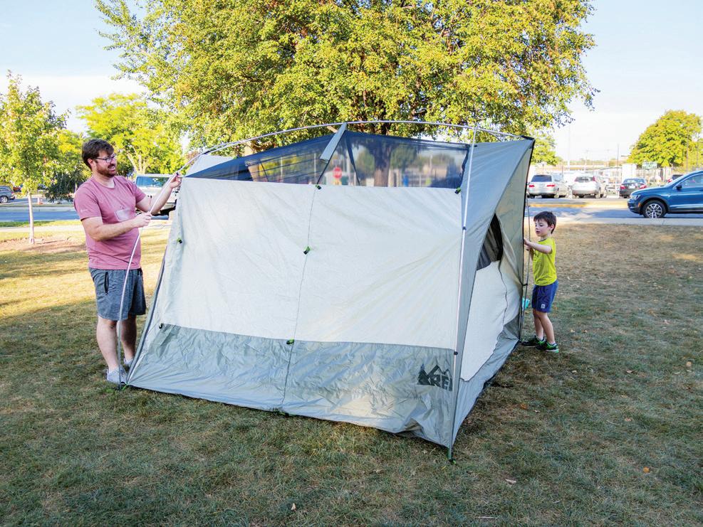 (Above) Rachel Hines and her son, (le ) Matt Hew itt and his son, and many others pitch their tents