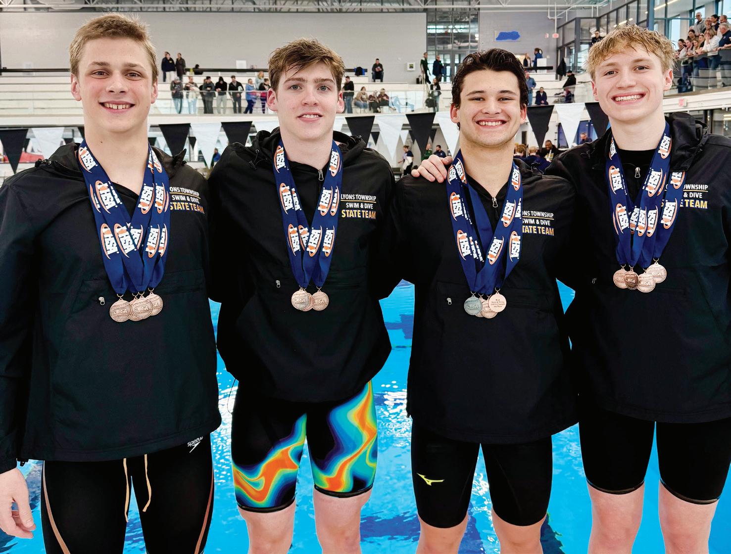Lyons Township’s Jovan Mijailov ic (le ), Jack Hannon, Patrick Rhatigan and Matthew Ferguson earned multiple all-sta te medals at the boys sw imming and diving state nals Saturday.