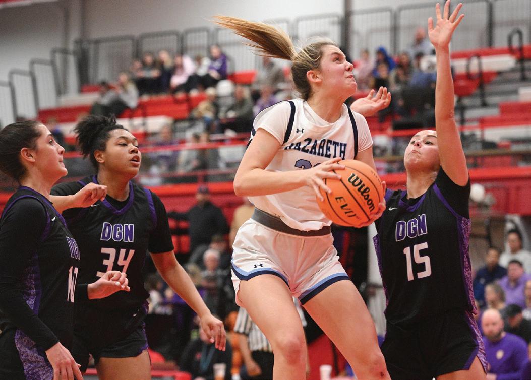 Nazareth’s Stella Sakalas (32) dr ives to the basket between the Downers Grove North defense dur ing the Class 4A Hinsdale Central Sectional nals, Feb. 26, in Hinsdale.