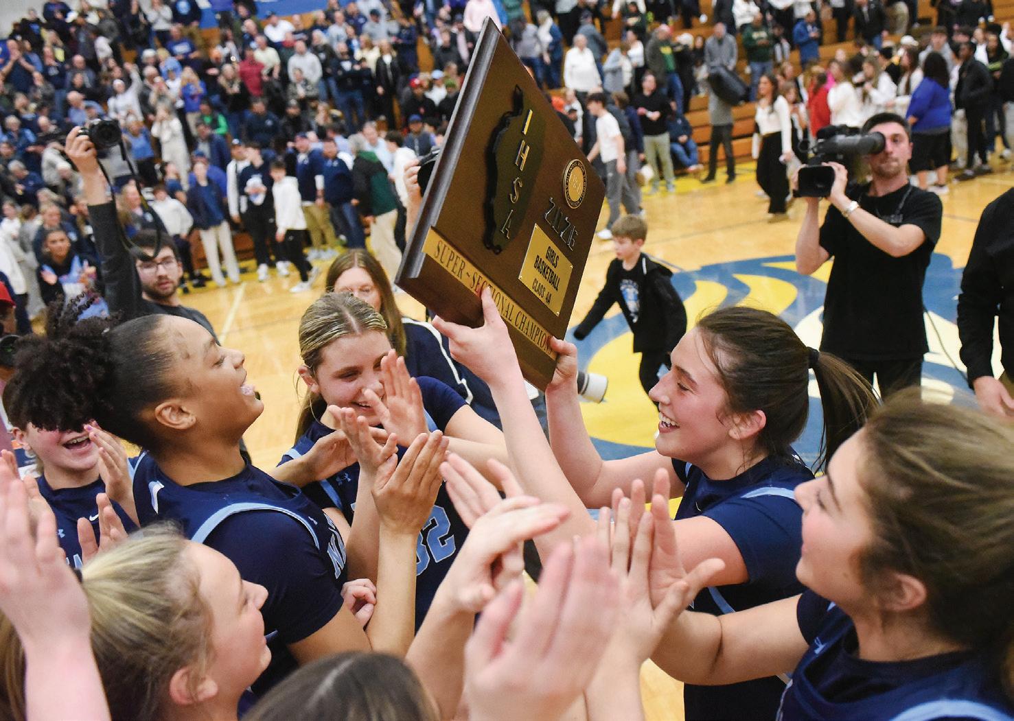 Nazareth’s Sophia Towne (5) raises the championship plaque with her teammates a er defeating Waubonsie Valley 54-42 during the Class 4A Lyons Super-Sectional, March 2, in La Grange.