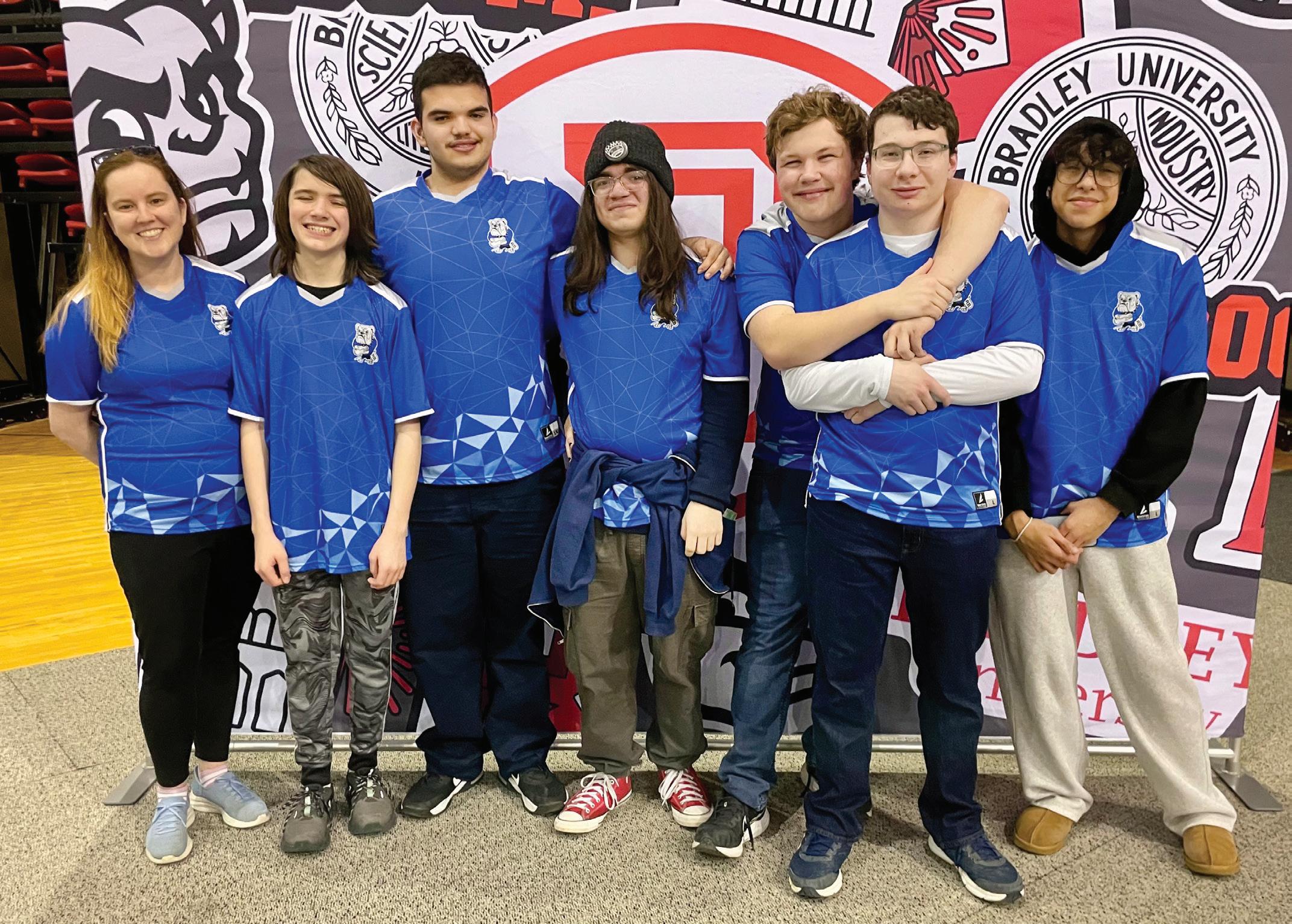 From le , Megan Welch, Camden Truesdale, Daniel DeHoyos, Julian DeHoyos, Declan Gibbs, Matthew Feeney and Daniel Malave pose for a photo at their tournament at Bradley University. Gibbs is the team’s highest-ranked solo player while the others played as a crew.
