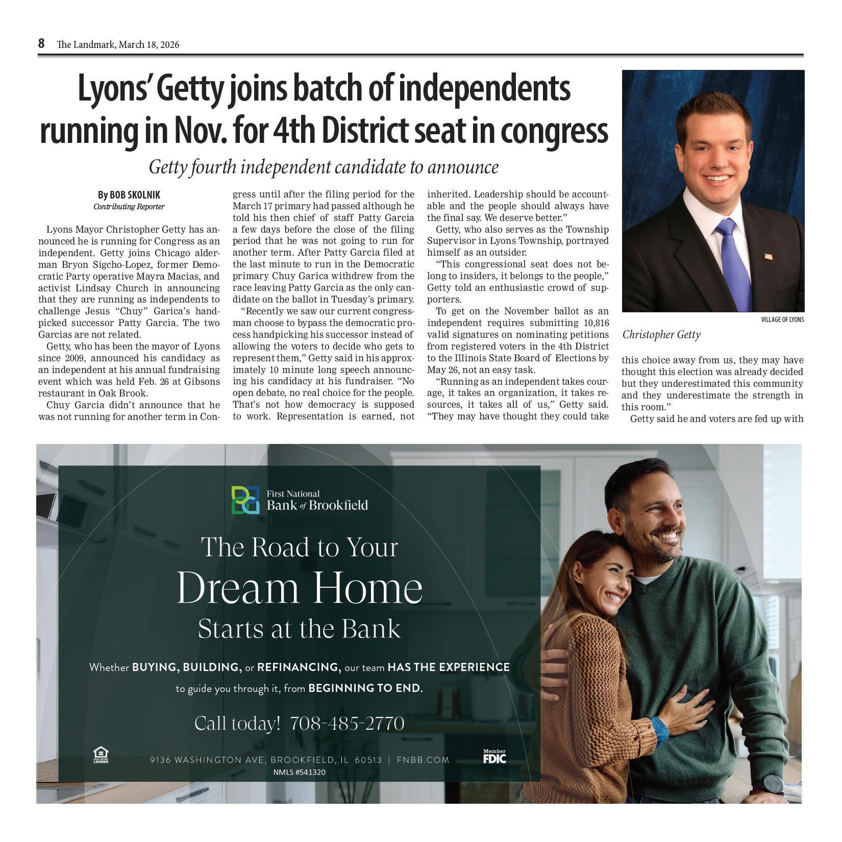 Getty could have a powerful ally if Steve Landek, the mayor of Bridgeview and the Lyons Democratic Committeeman from Lyons Township, decides to support him. Landek did not return a phone call or text message asking him if he was going to support Getty’s campaign for Cong ress.
