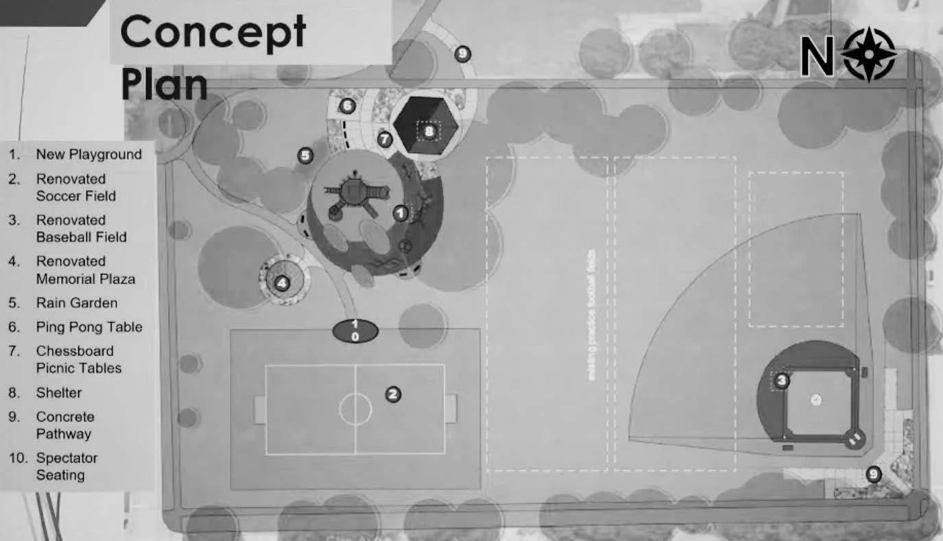 Beyond the renovations, additions to the park will include a new, dedicated soccer field west of the playground with spectator seating, as well as a new game table space with pingpong and chess tables between the playground and the picnic shelter. A new rain garden next to the playground with native plants will provide green infrastructure for the park alongside low grasses, perennial flowers and other plants that cover the ground.