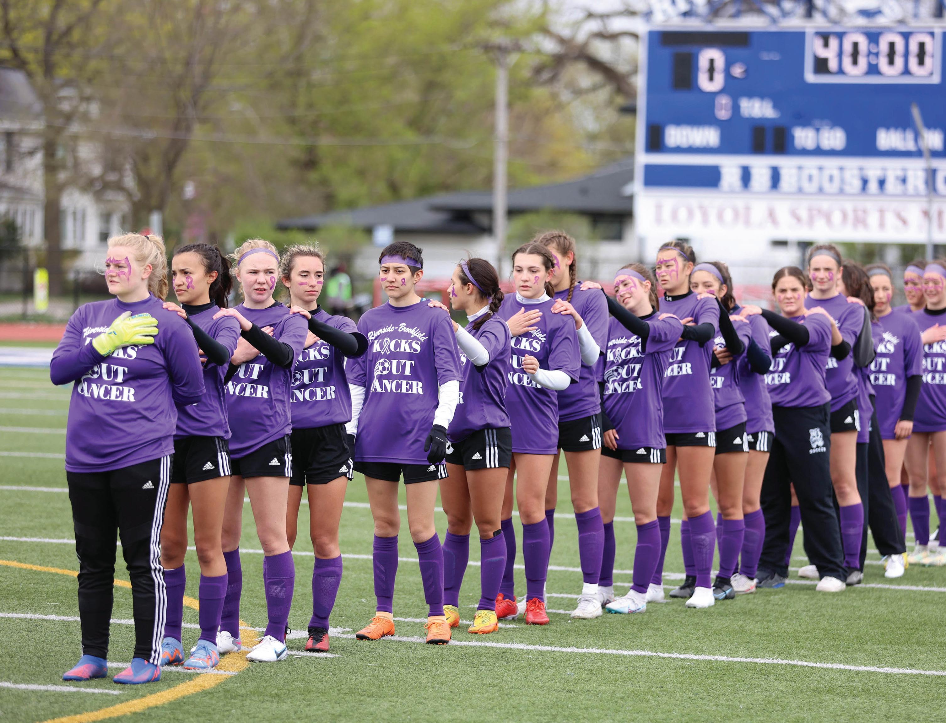 RBHS soccer players, including organizer Sophie Swicionis (7th from le ) and Lucy Drenth (third from le ), whose father coached visiting Rolling Meadows and whose mother succumbed to cancer when she was a toddler, line up on the eld before their Kick Out Cancer game/fundraiser on April 22.