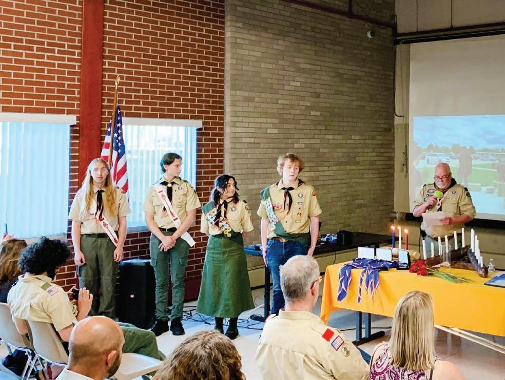 Abigail Sokol, Kyle Lyth, Salma Hummos and Connor Stenson stand at their Eagle Scout ceremony May 22 while Troop 90 Scoutmaster Ken Knasiak speaks.